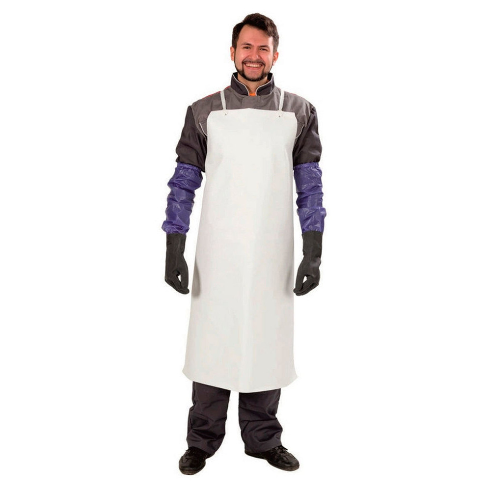 Тип Б. Изготовлен из двухсторонней безосновной ткани ПВХ с добавлением полиуретана, что позволяет не впитывать запахи, кровь, жиры, масла и другие загрязняющие продукты, плотностью 500 гр. К60 Щ40. Морозостойкий, долговечный, износостойкий для любого пищевого производства. Размеры 120*100 см. С люверсами, в которые продеты и приварены завязки из основной ткани.