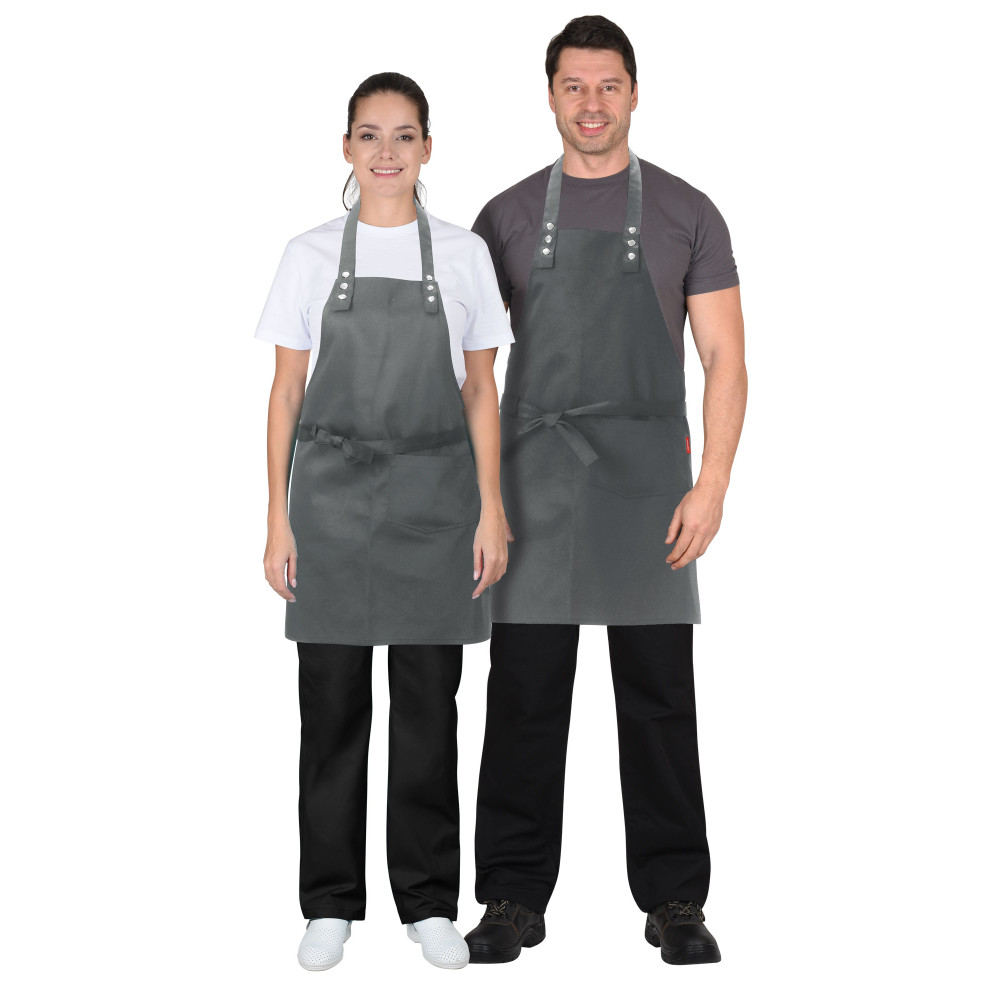 Фартук с нагрудником и с боковыми завязками для регулировки объема. Съёмная шейная бретель, пристёгивающаяся на кнопки. В нижней левой части накладной карман. На правой стороне фартука, на уровне притачивания боковых завязок, шлёвка.