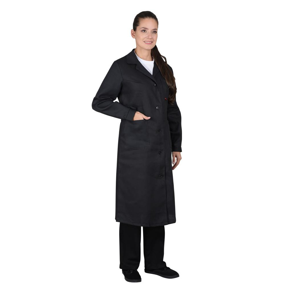 100% х/б. Отложной воротник, застёжка на пуговицы, два кармана. Манжеты рукавов на пуговице. По талии спинки - хлястик. ГОСТ