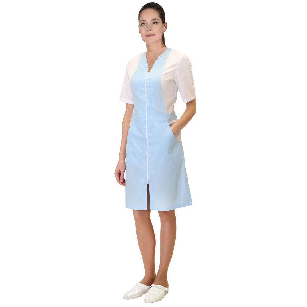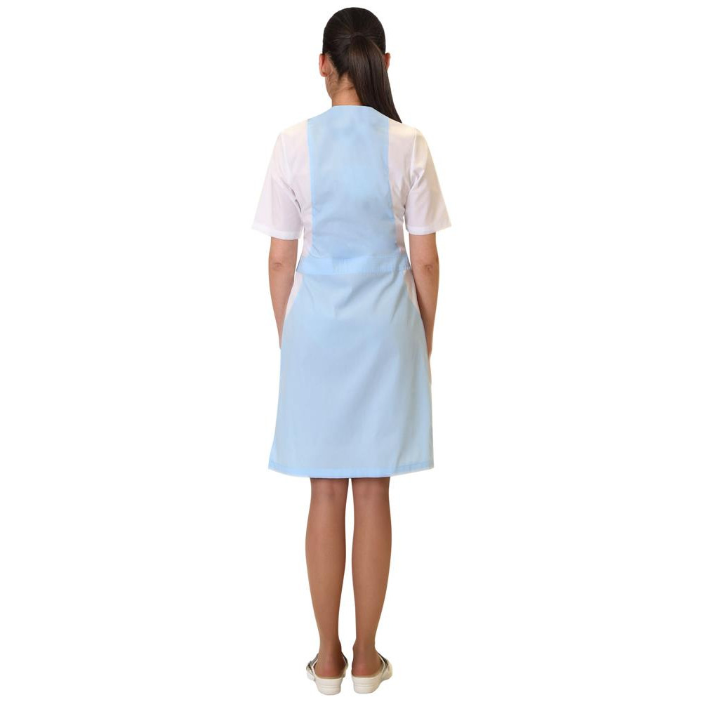 полуприлегающего силуэта из ткани голубого цвета с белой отделкой. Центральная