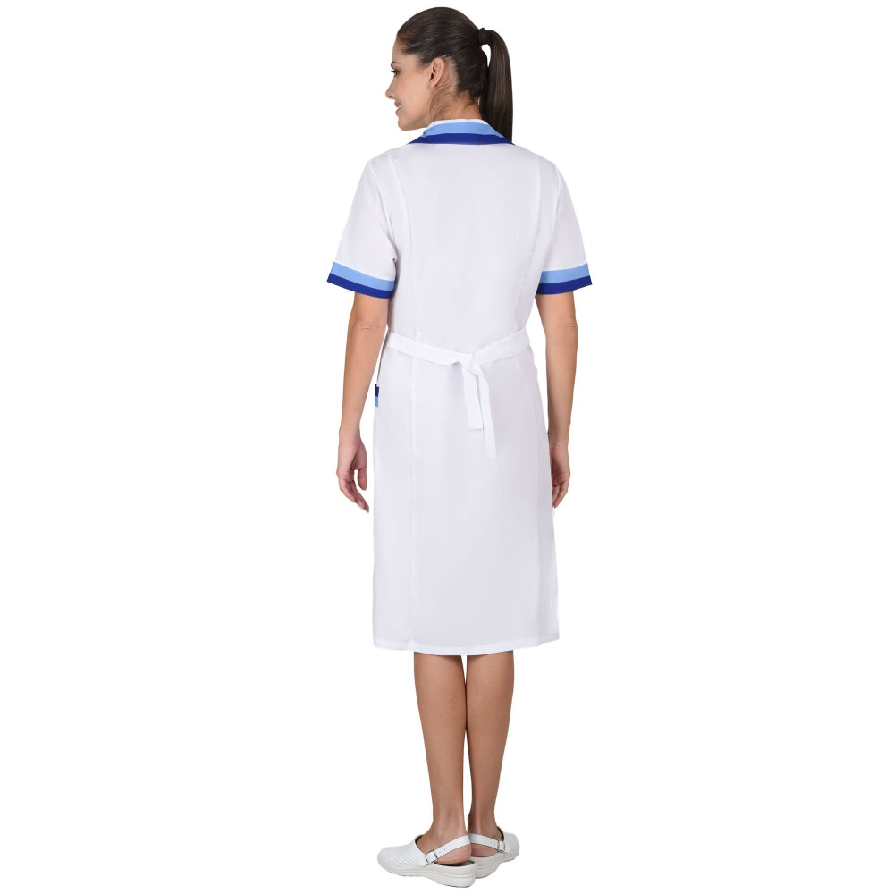 Халат с двумя нижними накладными карманами, отложным воротником и короткими рукавами. Ширина по линии талии регулируется хлястиком. Воротник, рукава и карманы с яркими отделочными элементами.