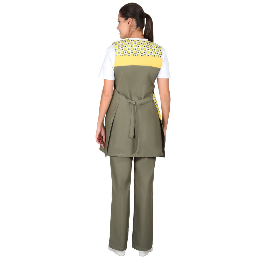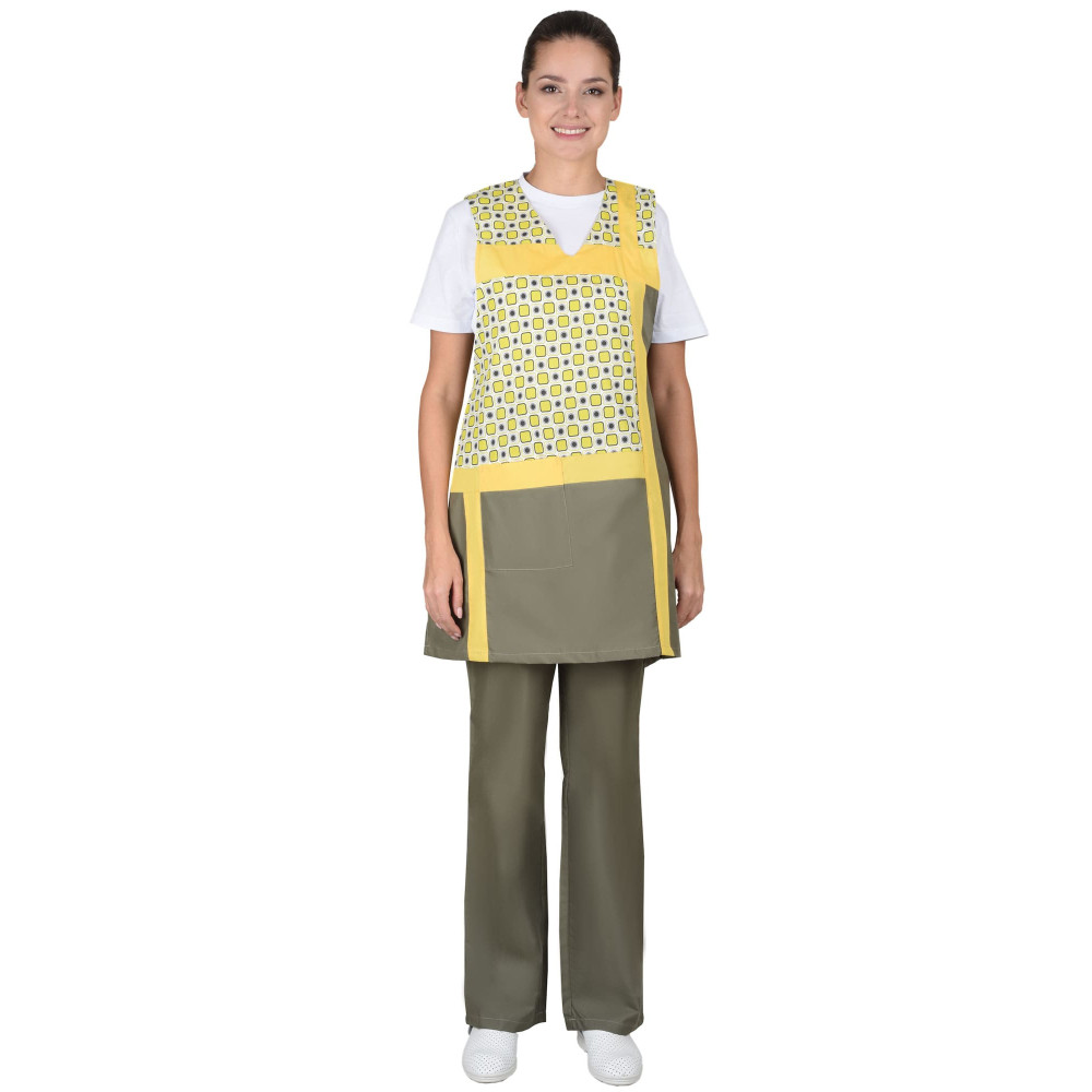 Комплект женский комбинированный , трехцветный, состоит из фартука-сарафана и брюк. Фартук-сарафан с V-образным вырезом горловины и прямой линией низа, с боковыми завязками на полочке и резинкой и пуговицей на спинке для регулировки объема по талии, с накладным карманом на правой половинке полочки. Брюки прямые, без застежки, с притачным поясом, частично стянутым резинкой и с накладными боковыми карманами.