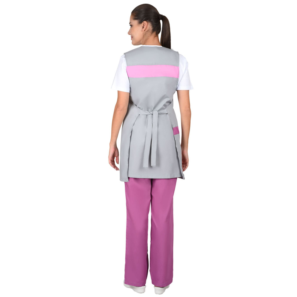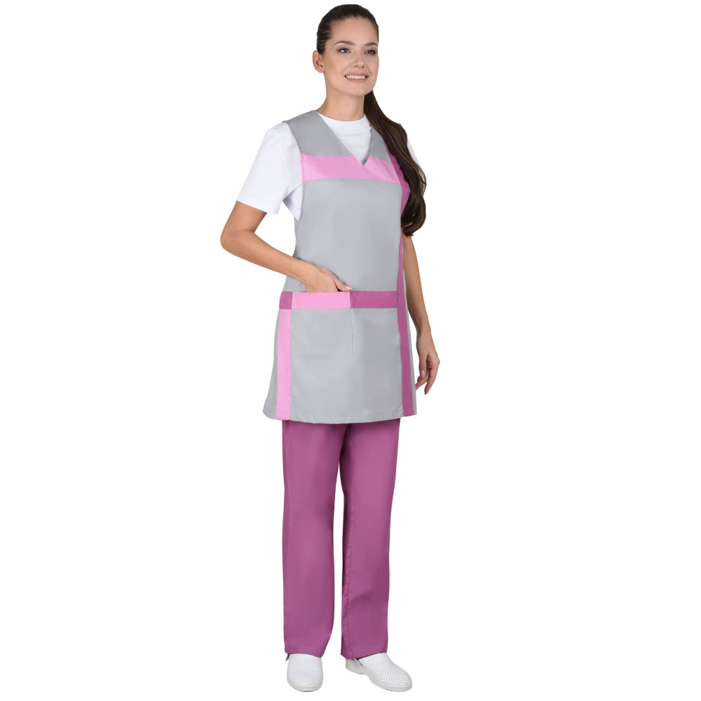 Комплект женский комбинированный , трехцветный, состоит из фартука-сарафана и брюк. Фартук-сарафан с V-образным вырезом горловины и прямой линией низа, с боковыми завязками на полочке и резинкой и пуговицей на спинке для регулировки объема по талии, с накладным карманом на правой половинке полочки. Брюки прямые, без застежки, с притачным поясом, частично стянутым резинкой и с накладными боковыми карманами.