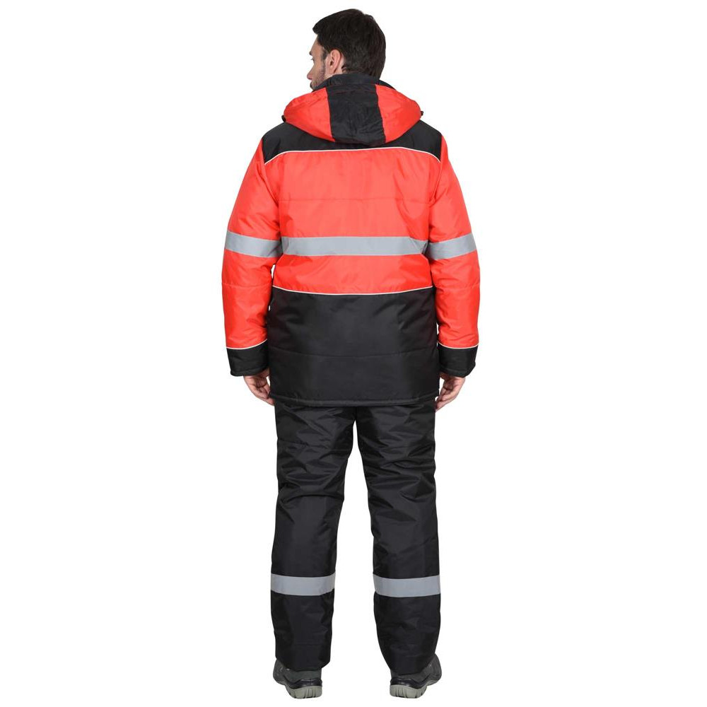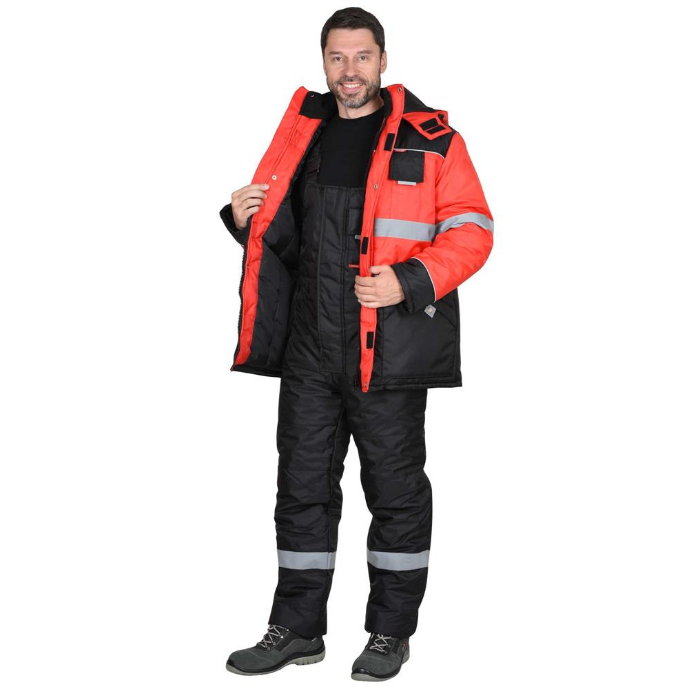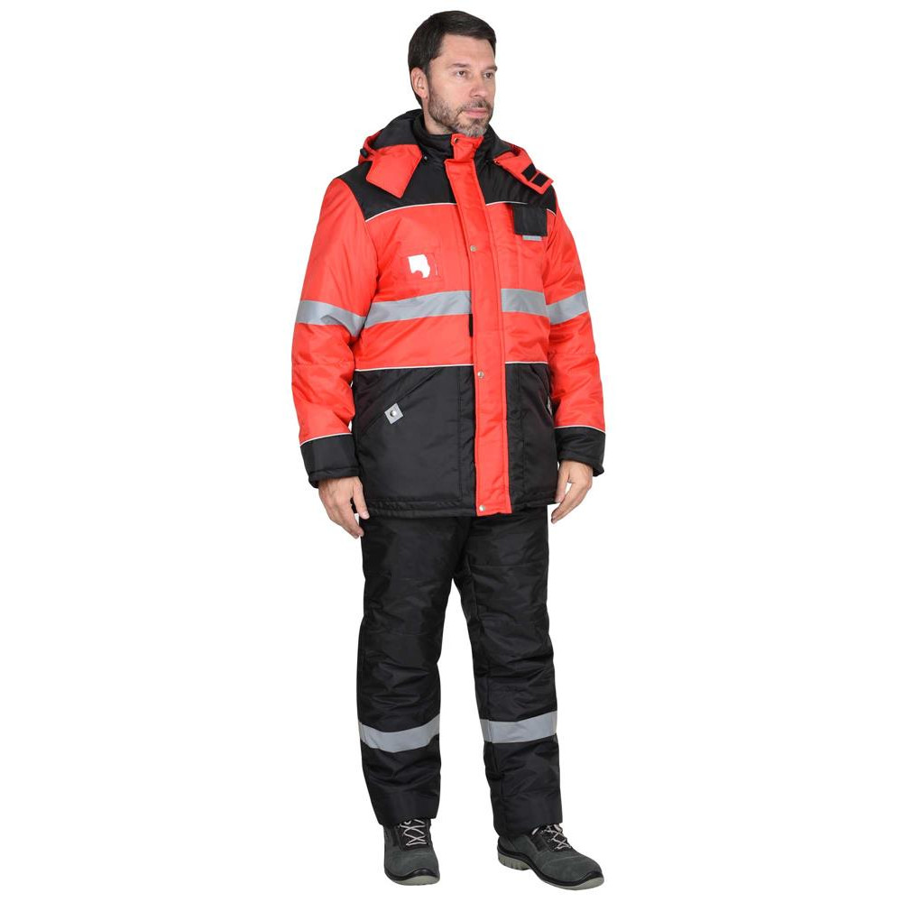 Куртка прямого силуэта, удлинённая, утеплённая, с воротником стойка (внутренний воротник из флиса) и съёмным утеплённым капюшоном, куртка застёгивается на 2-х замковую молнию, закрытую ветрозащитной планкой, застёгивающейся на кнопки и липучку, рукава с внутренней трикотажной манжетой, подкладка куртки с внутренней ветрозащитной юбкой и внутренним карманом на молнии. Куртка с верхними и нижними карманами. Верхний правый карман с молнией и с окном для бейджа, левый карман для рации. Нижние карманы накладные с клапаном на кнопке. Для обеспечения сигнальной видимости в тёмное время суток в куртке предусмотрены светоотражающая полоса (СОП), светоотражающий кант и светоотражающие элементы на карманах.