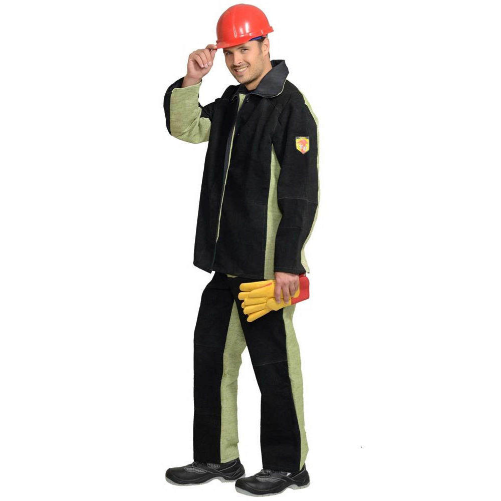 Куртка прямая с потайной застёжкой на пуговицы, с отложным воротником, с накладкой из бязи в области прилегания к шее для комфорта, с боковыми карманами в швах, с внутренними защитными манжетами. На куртке в районе подмышек и на кокетке спинки вентиляционные отверстия для воздухообмена. Перед куртки и передняя часть рукавов выполнены из спилока кожевенного толщиной 1,3 мм, с изнаночной стороны спилок накрыт подкладкой из бязи (100%ХБ).