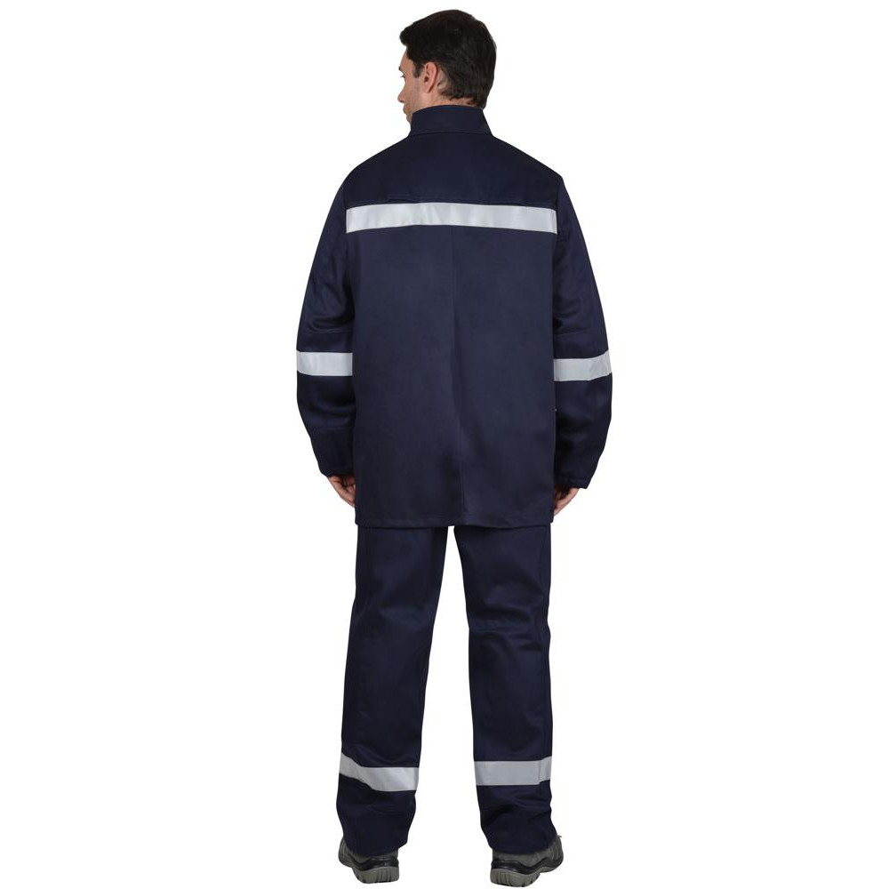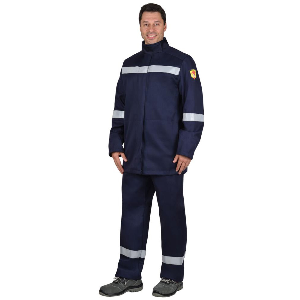 Костюм из огнеупорной ткани, состоит из куртки и брюк, на куртке и брюках предусмотрена огнеупорная светоотражающая лента шириной 50мм для обозначения сигнальной видимости.