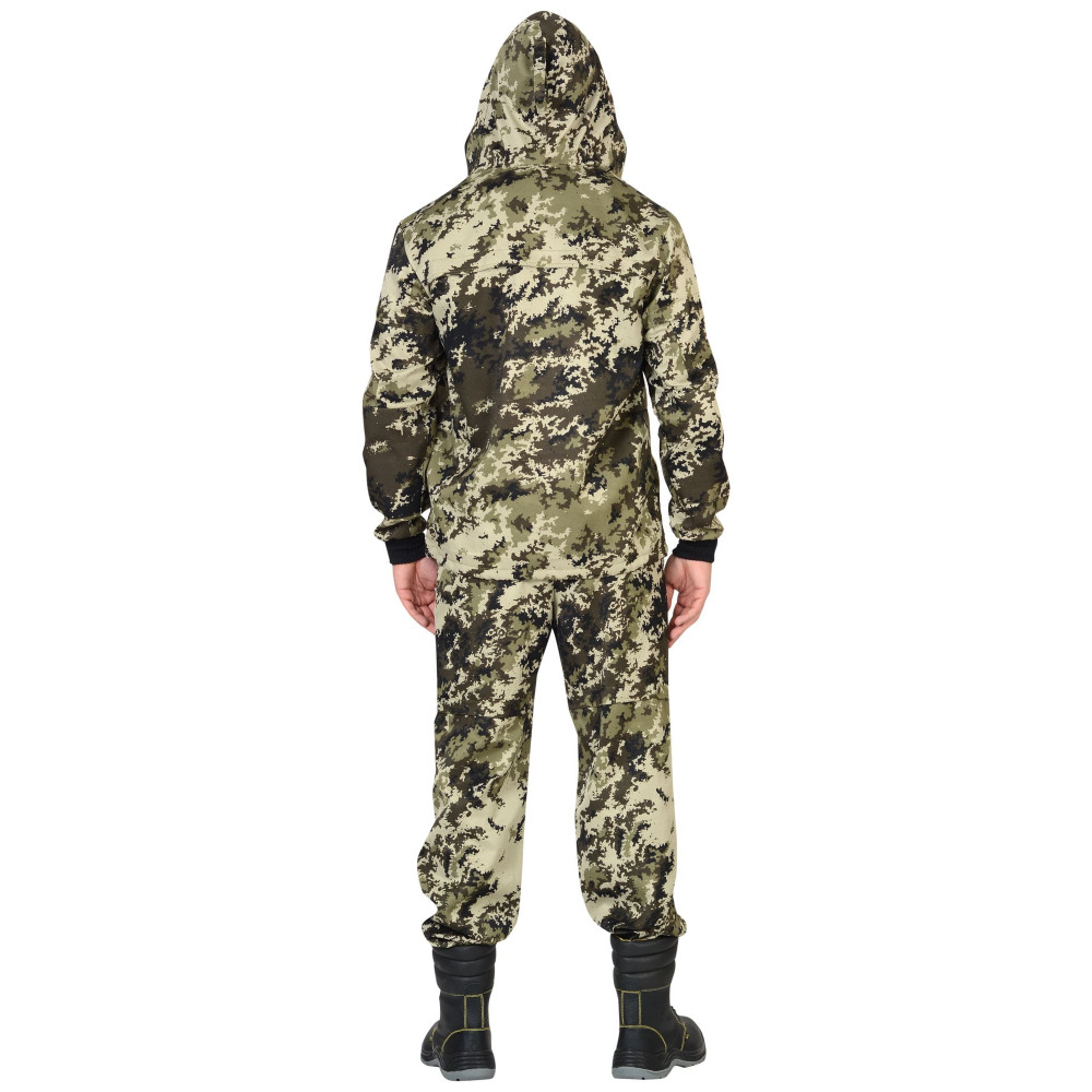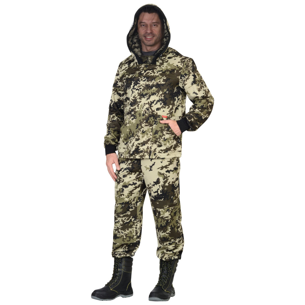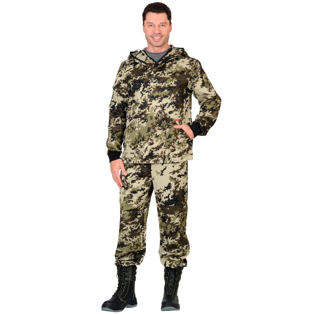 Куртка с притачным капюшоном с противомоскитной сеткой и накладным нагрудным карманом, в который при необходимости можно спрятать противомоскитную сетку. Рукава с трикотажной манжетой, ширина куртки внизу регулируется. Брюки с цельнокроеным поясом, стянутым эластичной лентой, с 4-мя шлёвками, с наколенниками, с накладным карманом с клапаном, застёгивающимся на ленту "контакт", низ брюк с трикотажными манжетами.