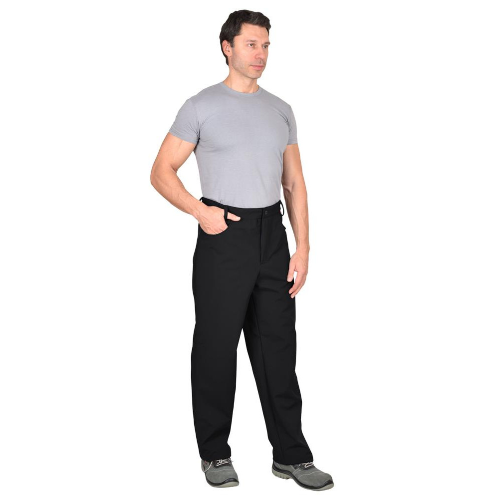 Брюки прямые, на притачном поясе, с застёжкой спереди гульфик на тесьму «молния». Брюки с боковыми внутренними карманами фигурным входом, на задних половинках с отрезной кокеткой. Ткань верха - «Софтшелл» состав: 100% п/э.; пл. 350 г/м ГОСТ 25295-2003