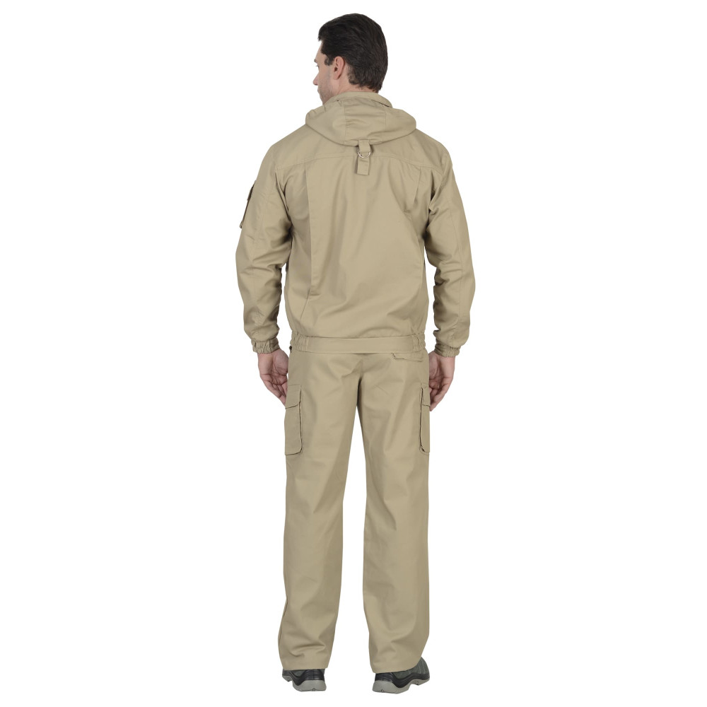 Куртка короткая, прямого силуэта, с центральной застёжкой на молнию накрытой ветрозащитным клапаном, воротник стойка, пристёгивающимся капюшоном, различными многофункциональными накладными карманами с клапанами. Рукава с манжетами и патой регулирующий ширину. Низ куртки с притачным поясом стянутым, частично, резинкой.Брюки прямые с притачным поясом стянутым, частично резинкой и застёгивающимся на пуговицу, со шлёвками, застёжкой гульфика на молнию, с различными функциональными карманами. Низ брюк регулируется эластичным шнуром.Ткань: «Родос» 65% п/э, 35 % х/б, пл. 240 г/м.ГОСТ 12.4.280-2014