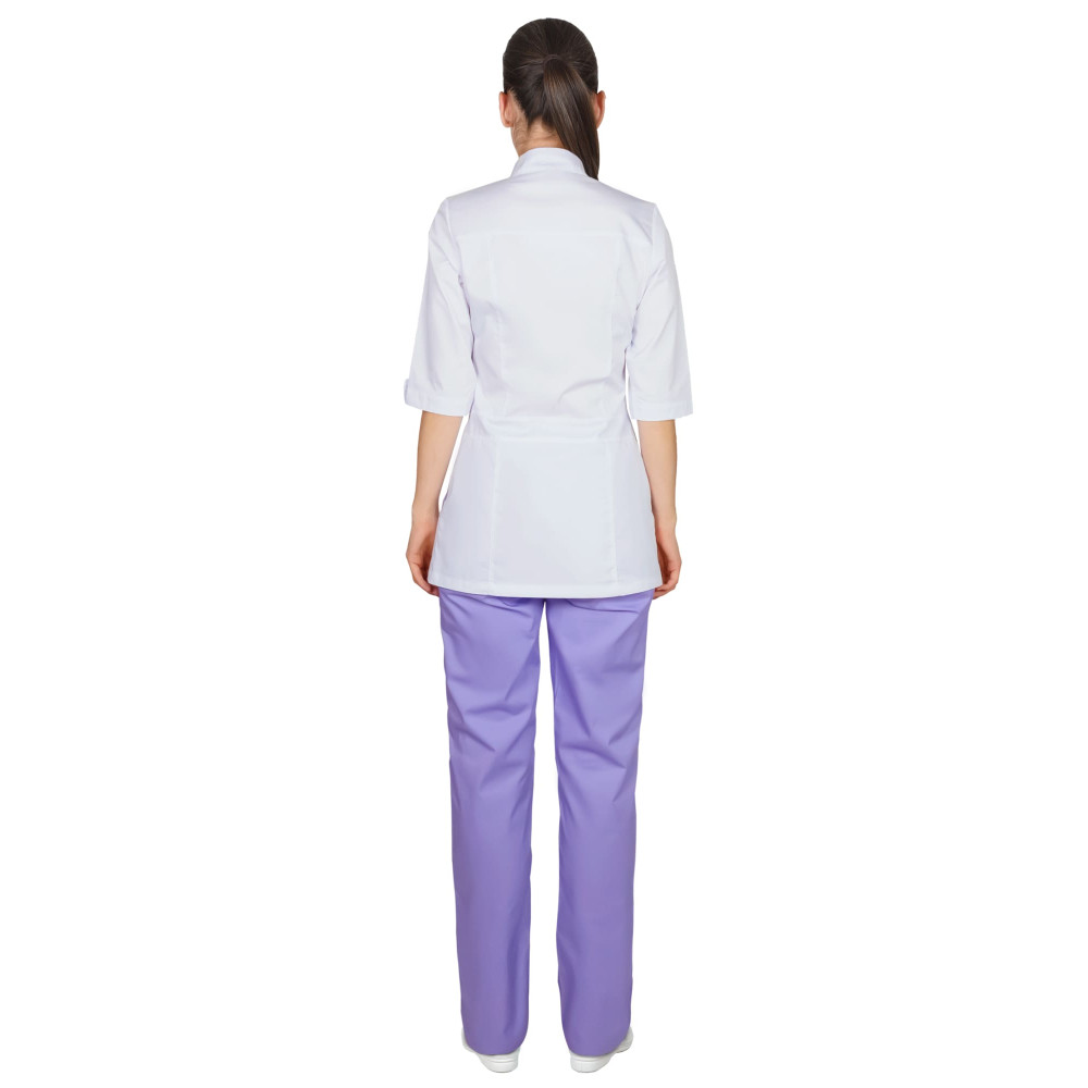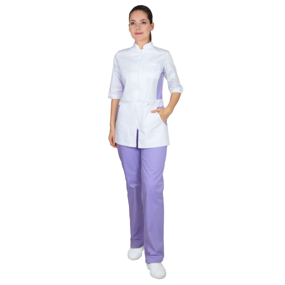 Классическая комбинация белого и фиолетового цветов создают нежный и элегантный визуальный эффект. Костюм идеально подойдет для работников медицинской и бьюти сфер.