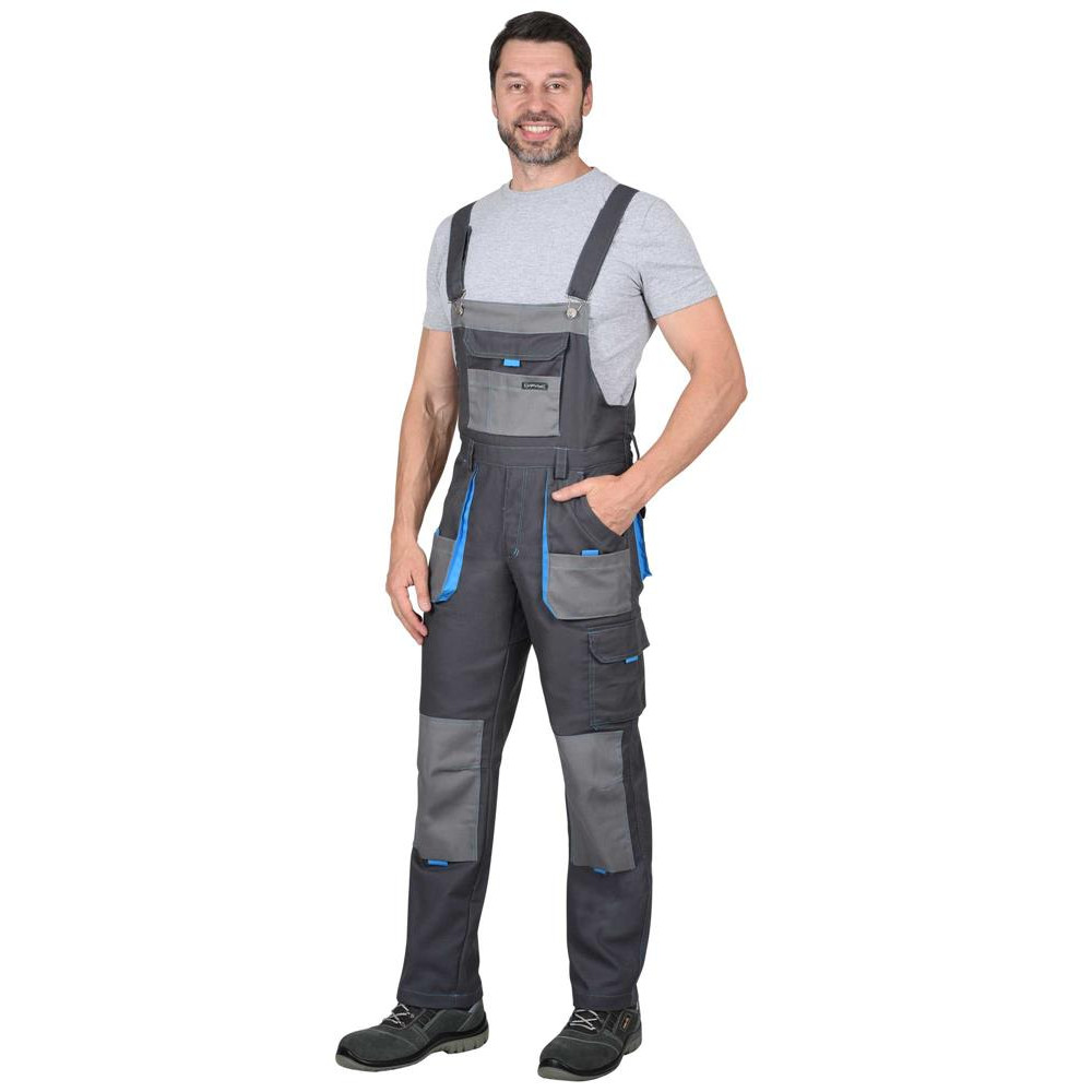 Полукомбинезон с застёжкой спереди - гульфик с молнией и с застёжкой в правом боковом шве на пуговицы, с наколенниками, с бретелями. Полукомбинезон спереди и сзади с накладными карманами. Спереди с нагрудным карманом с клапаном, на липучке. Сзади полукомбинезон по талии стянут резинкой для лучшего прилегания по фигуре. Бретели с резинкой, длина бретелей регулируется при помощи металлической пряжки.