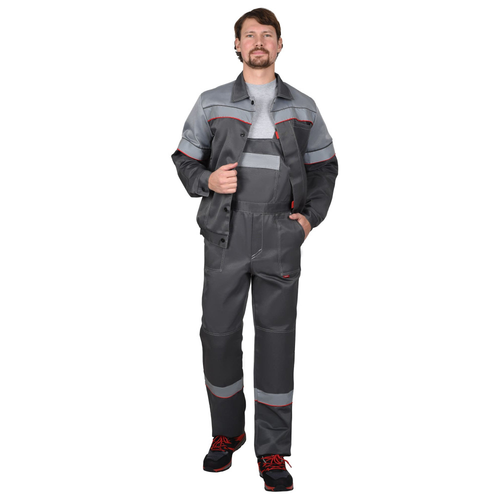 Полукомбинезон прямого кроя, с застежкой в правом боковом шве на 2 пуговицы и спереди - гульфик с молнией. Полукомбинезон с нагрудным карманом с клапаном, боковыми карманами и с наколенниками. В полукомбинезоне предусмотрена лента светоотражающая ш.50 мм для сигнальной видимости.