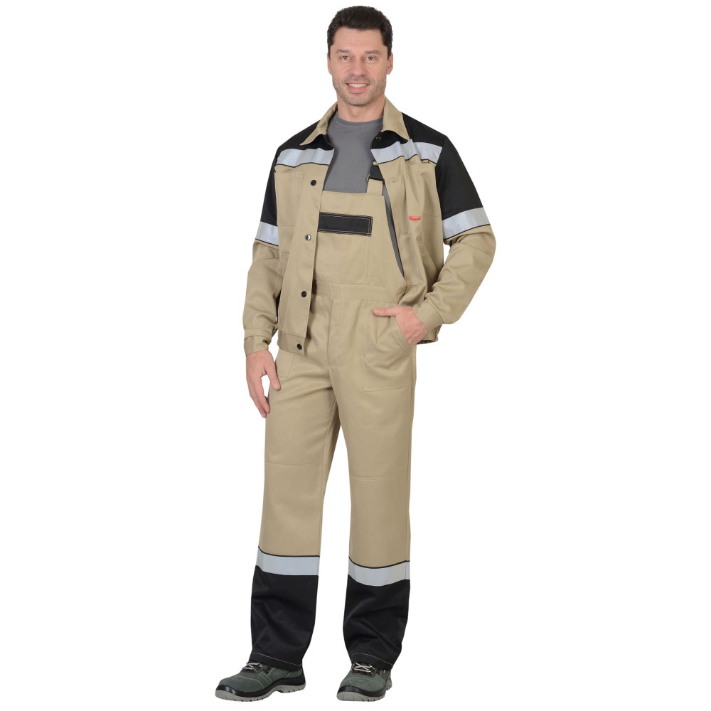 Куртка укороченная ; с центральной застежкой на пуговицы, с налокотниками , с поясом на резинке с накладными карманами и светоотражающей лентой 50 мм. Полукомбинезон с застежкой гульфика на тесьму "молния", с боковой застежкой на пуговицы, с накладными карманами, с наколенниками и светоотражающей лентой 50 мм.