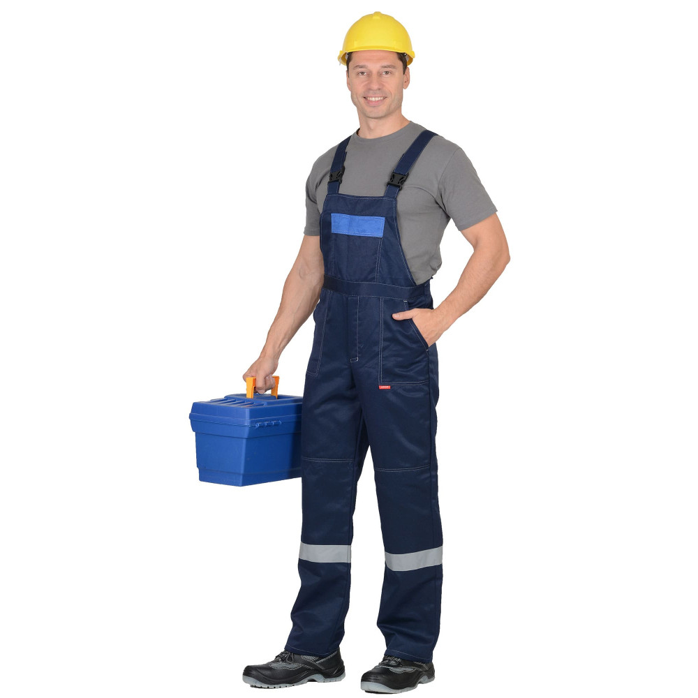 Куртка укороченная , с центральной застежкой на пуговицы, с налокотниками , с поясом на резинке с накладными карманами и светоотражающей лентой 50 мм. Полукомбинезон с застежкой гульфика на тесьму "молния", с боковой застежкой на пуговицы, с накладными карманами, с наколенниками и светоотражающей лентой 50 мм