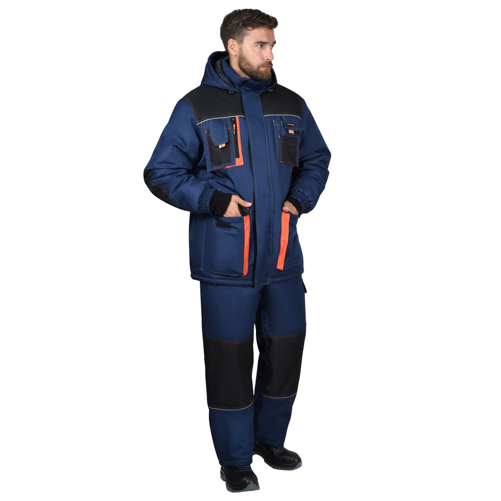 Куртка прямого силуэта, удлинённая, на утеплённой подкладке, с втачным воротником стойка и втачным капюшоном, центральной застёжкой на молнию и внешним ветрозащитным клапаном с липучкой от края воротника, втачными рукавами с отрезной манжетой частично стянутой резинкой и внутренней трикотажной манжетой. Внутренний воротник и подкладка куртки из полиэфирного трикотажного полотна - Флис. Подкладка куртки с ветрозащитной юбкой. Куртка с верхними и нижними накладными карманами, внутренним карманом с молнией на подкладке и карманом с молнией под ветрозащитным клапаном на левой половинке для документов размером А-4. Размер капюшона предусматривает возможность надевания его на каску. В куртке предусмотрено крепление бейджа.