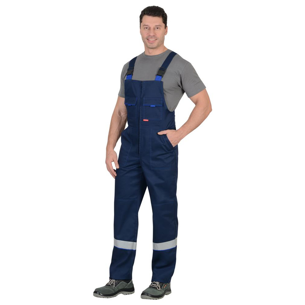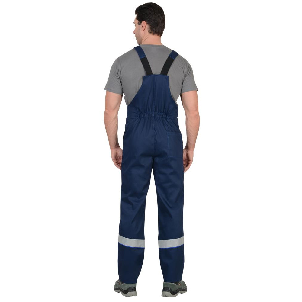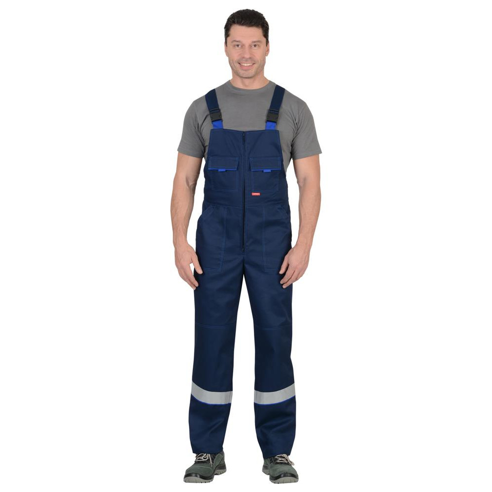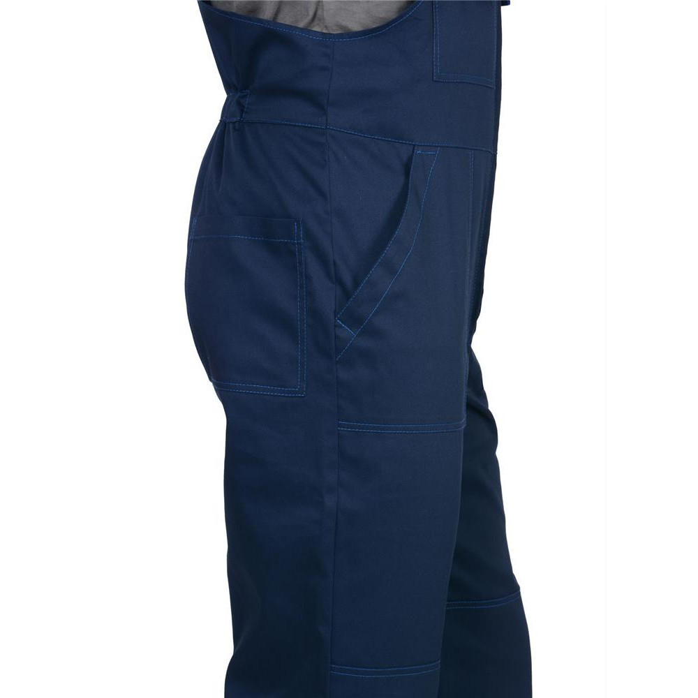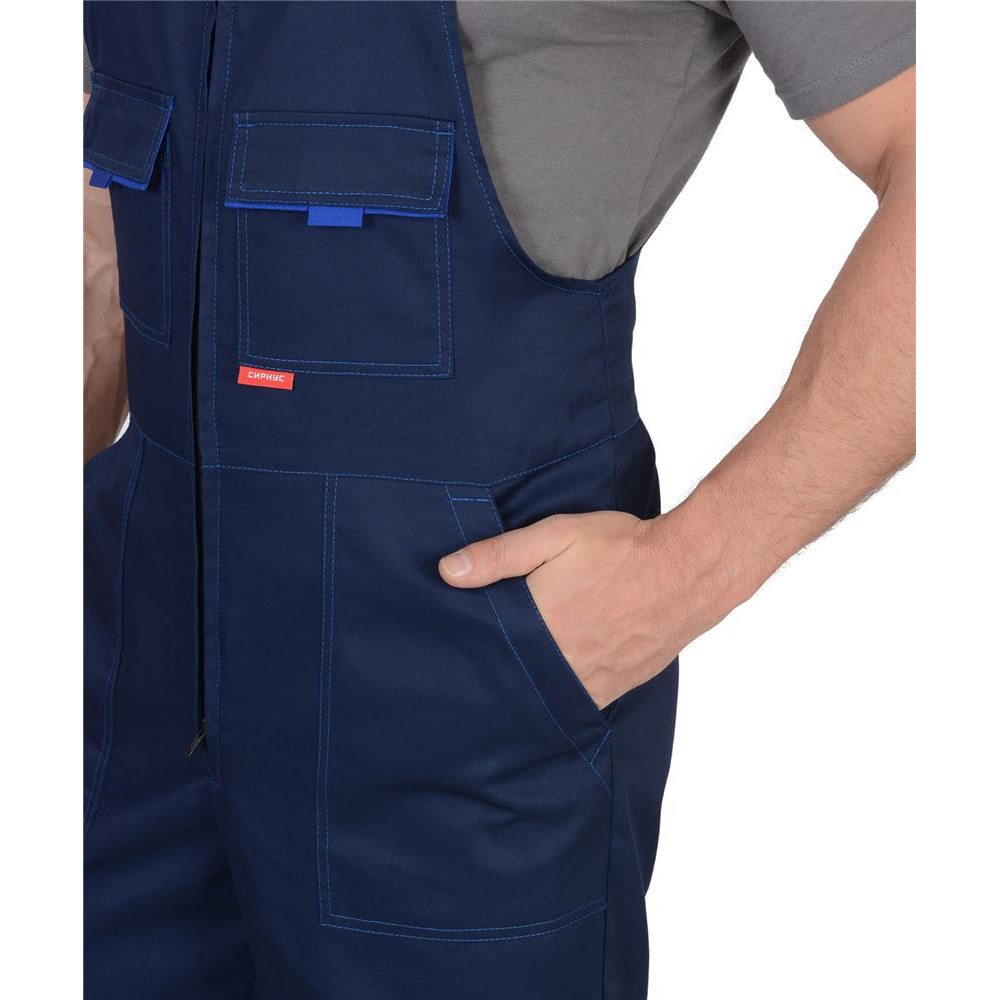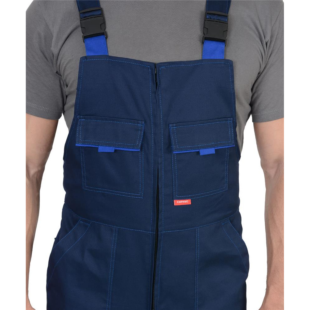 Полукомбинезон с центральной застёжкой на тесьму «молния»; отрезной грудкой, с накладными верхними карманами с клапанами, и нижними карманами с наклонным входом, с наколенниками, с эластичной лентой по спинке.