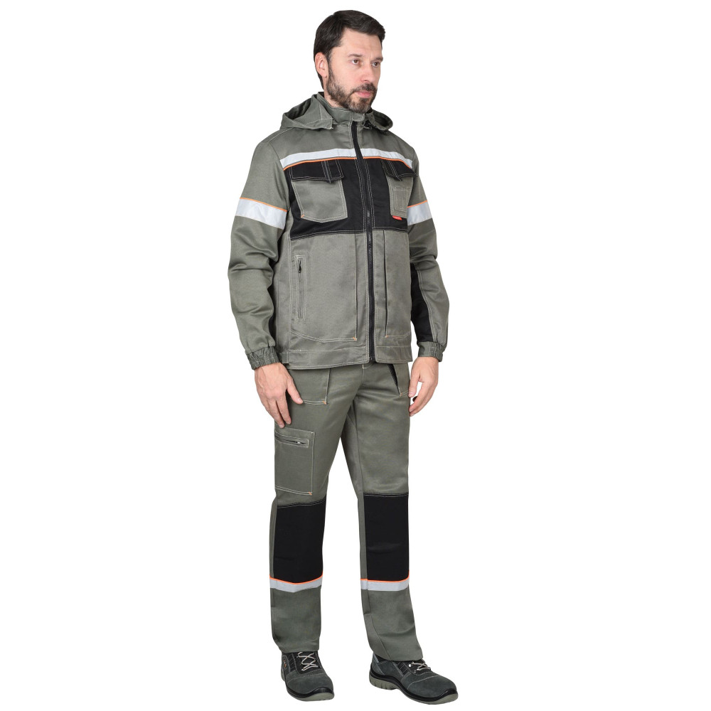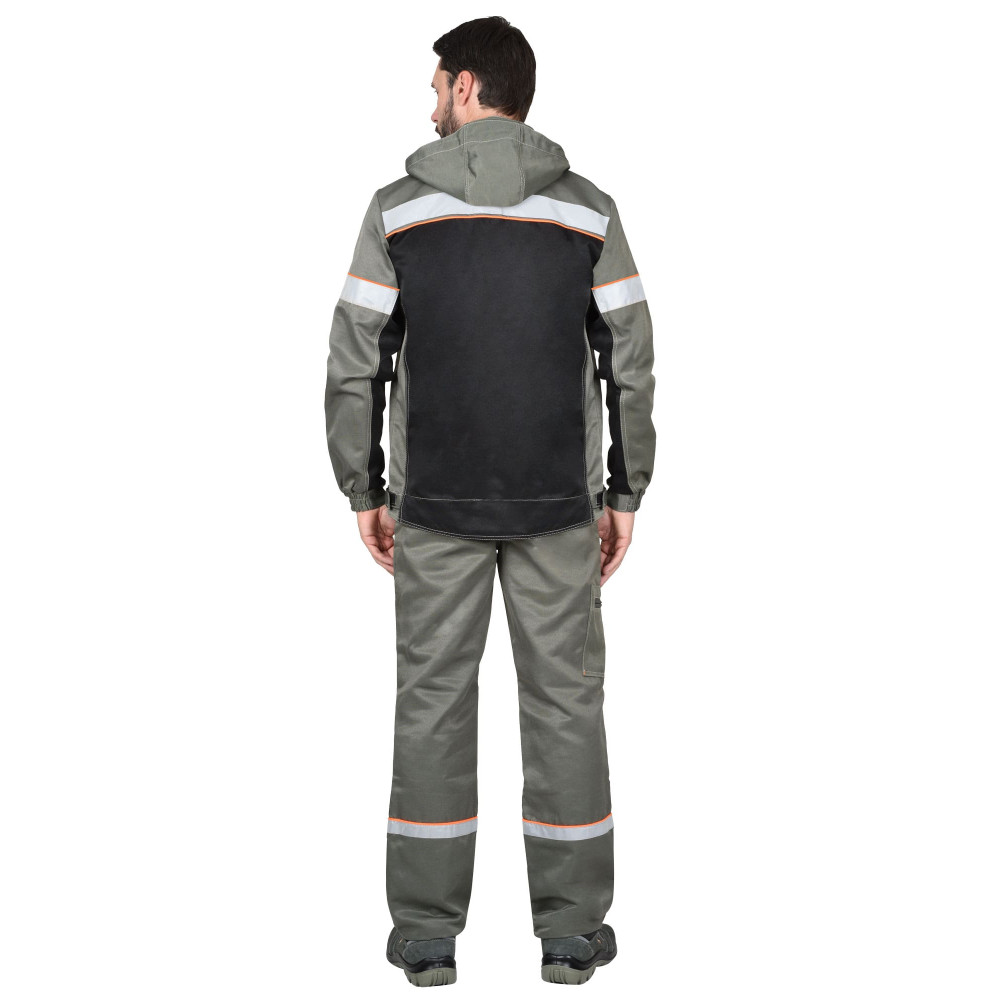 Куртка прямого силуэта, укороченная, с удлиненной фигурной спинкой, с центральной застёжкой на тесьму - «молния» однозамковую до верха, с подпланкой, воротником стойка, с пристёгивающимся капюшоном на молнию и верхними и нижними карманами. Ширина куртки по низу регулируется хлястиком на липучке. Изделие с втачными рукавами и притачной манжетой с частичной стяжкой на резинку ткацкую. В куртке предусмотрен кант контрастного цвета и ленты светоотражающей СОП (мелкодисперсной белой) ш.25 мм и 50 мм для обозначения сигнальной видимости.