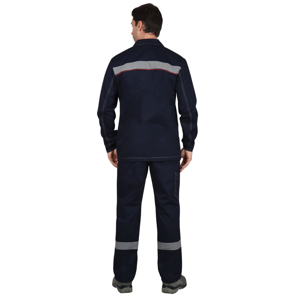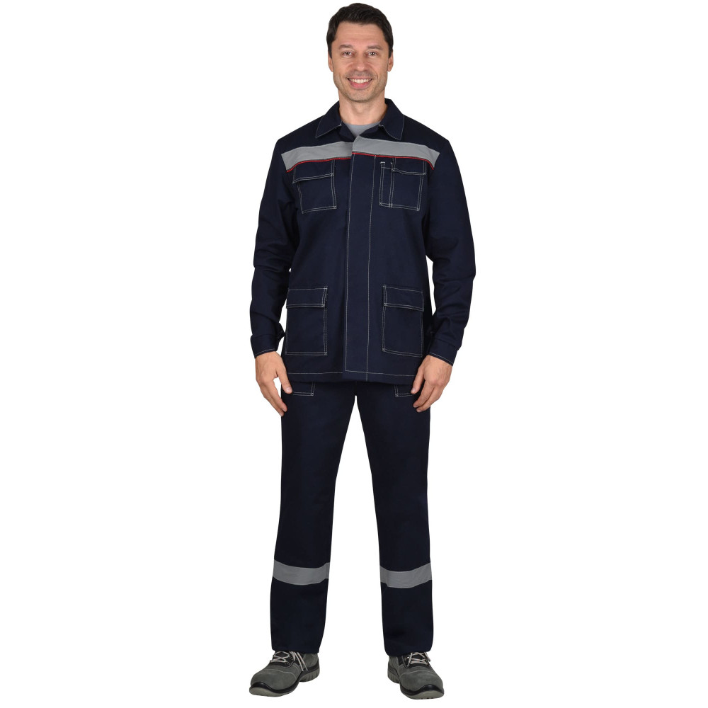 Куртка прямого силуэта; с центральной потайной застёжкой на пуговицах, отложным воротником; верхними и нижними накладными карманами с клапанами застегивающиеся на потайную липучку. Рукава втачные с притачными манжетами застегивающиеся на пуговицу. В куртке предусмотрена лента светоотражающая (серая) 50мм 100% п/э для обозначения сигнальной видимости. Брюки прямые, на притачном поясе, с накладными боковыми карманами с наклонным входом; с накладными фигурными задними карманами; с карманами под инструмента на правой задней половинки. В брюках предусмотрена лента светоотражающая (серая) 50мм 100% п/э для обозначения сигнальной видимости. ГОСТ 12.4.280-2014.