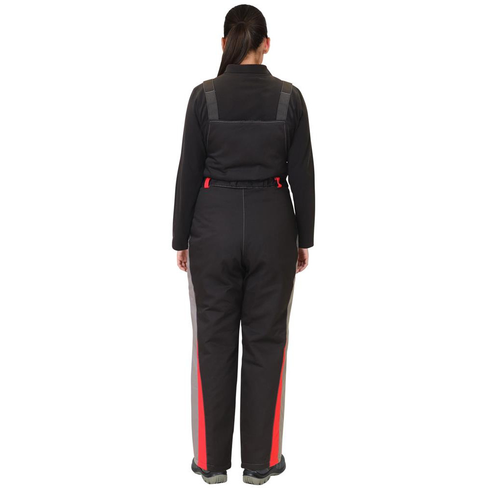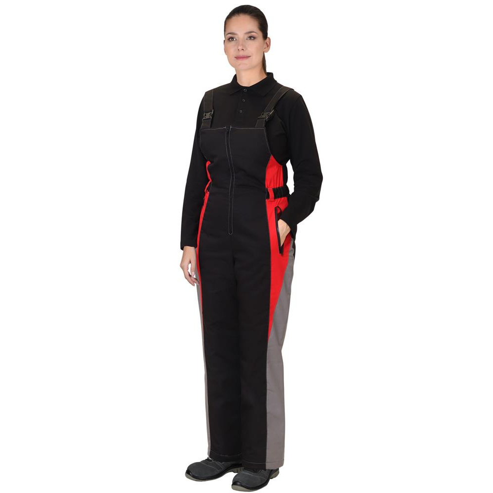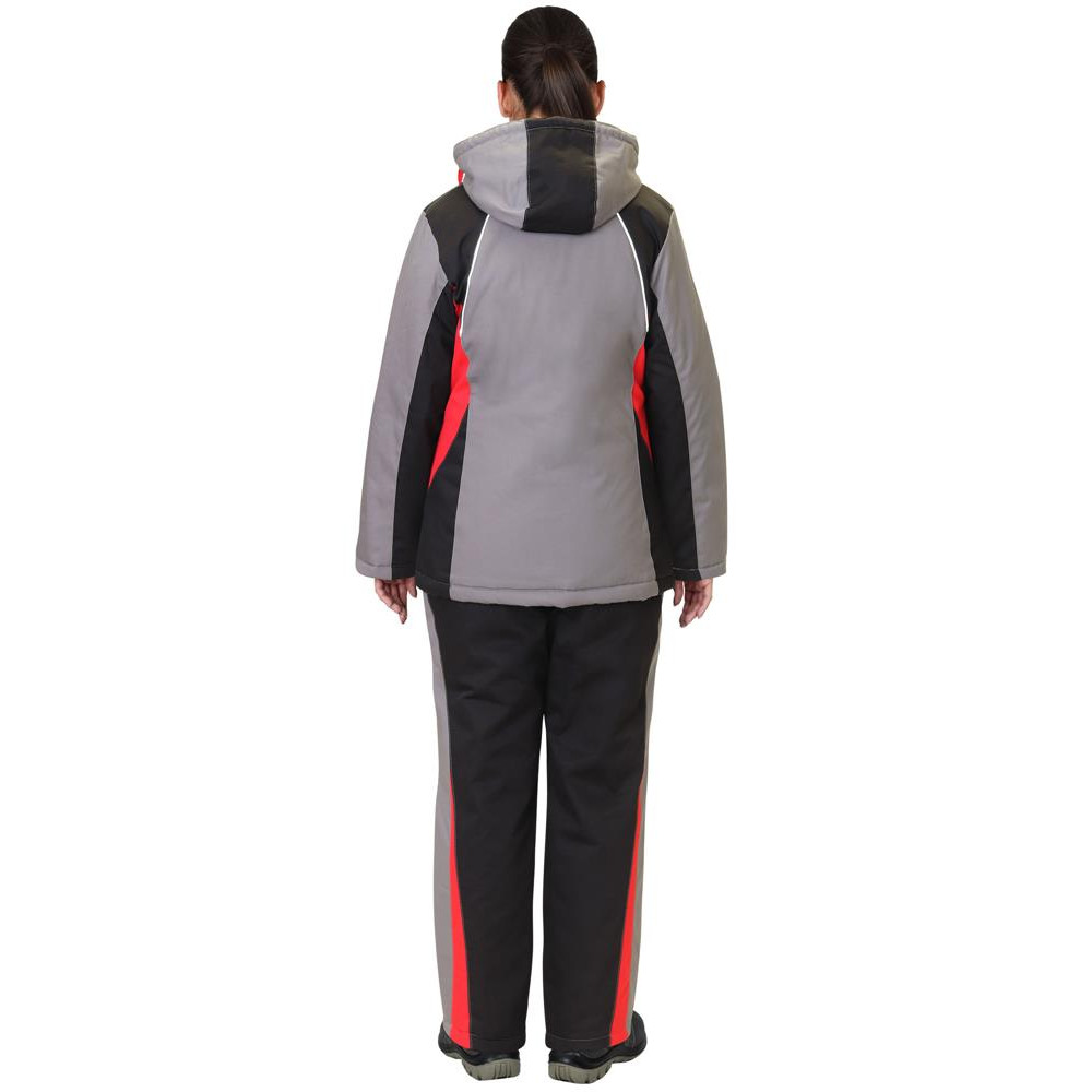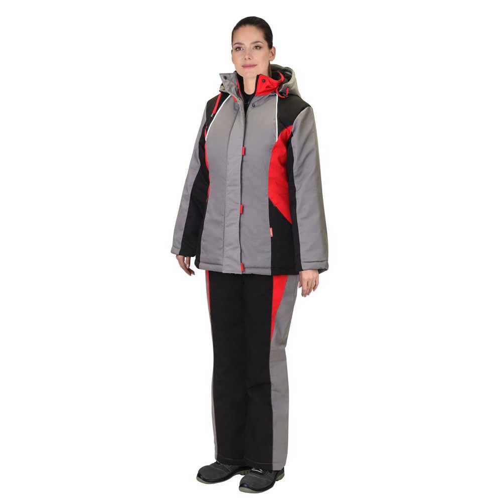 Куртка с притачной утеплённой, стеганой подкладкой, удлиненная, полуприлегающего силуэта, с воротником стойка, с центральной застёжкой на тесьму - «молния» до края воротника, накрытой ветрозащитной планкой, с нижними боковыми карманами в рельефных швах. Рукава втачные, с внутренними трикотажными манжетами. В куртке предусмотрен светоотражающий кант для обозначения сигнальной видимости. Куртка со съёмным капюшоном, пристёгивающимся на тесьму молния.Полукомбинезон с центральной застёжкой на молнию, с прорезными карманами с молнией, с настрочным поясом с внутренней резинкой. Полукомбинезон с бретелями, длина которых регулируется резинкой и фастексами.