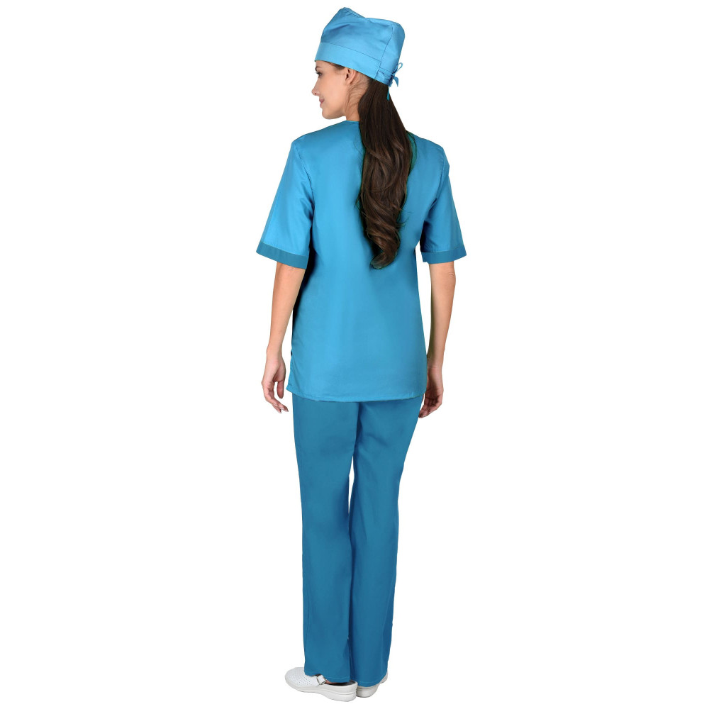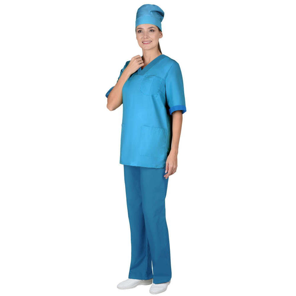 Костюм состоит из блузы, брюк и колпака. Блуза прямого покроя с V-образным вырезом горловины. На полочке один верхний и два нижних накладных кармана. Рукава короткие. Вырез горловины и манжеты рукавов из контрастной ткани. Брюки прямого покроя на резинке. Колпак одноцветный с отворотом.
