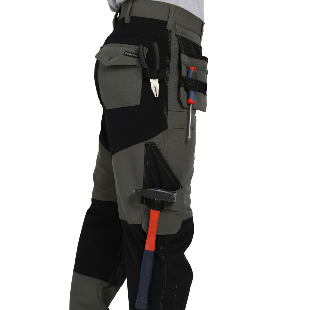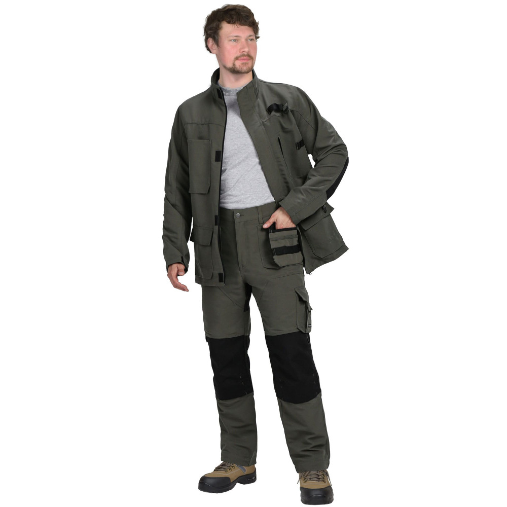 Брюки прямого кроя, с застежкой спереди на молнию, с отрезным поясом, с карманами спереди, сзади и на боковых швах, с объёмными наколенниками из плотной полиэфирной ткани с нижним входом для амортизационного вкладыша. Вверху шаговых швов ластовица из трикотажного полотна.