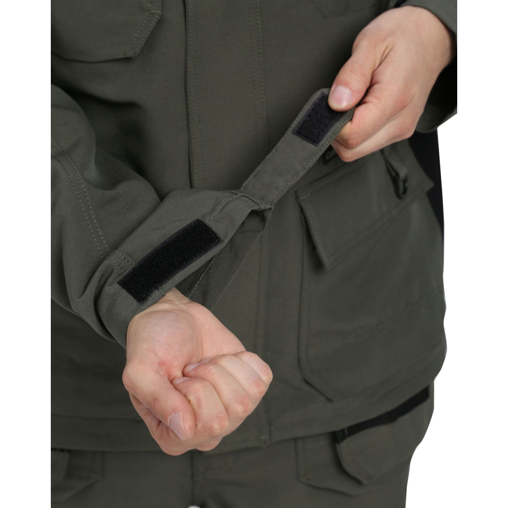 Куртка прямого силуэта, удлиненная, с центральной застежкой на молнию от верхнего края воротника до низа, накрытую ветрозащитным клапаном с потайными липучками, с воротником стойка, с верхним и нижними накладными карманами. Рукава втачные. Объём по низу куртки и низу рукава регулируется хлястиками с липучками.