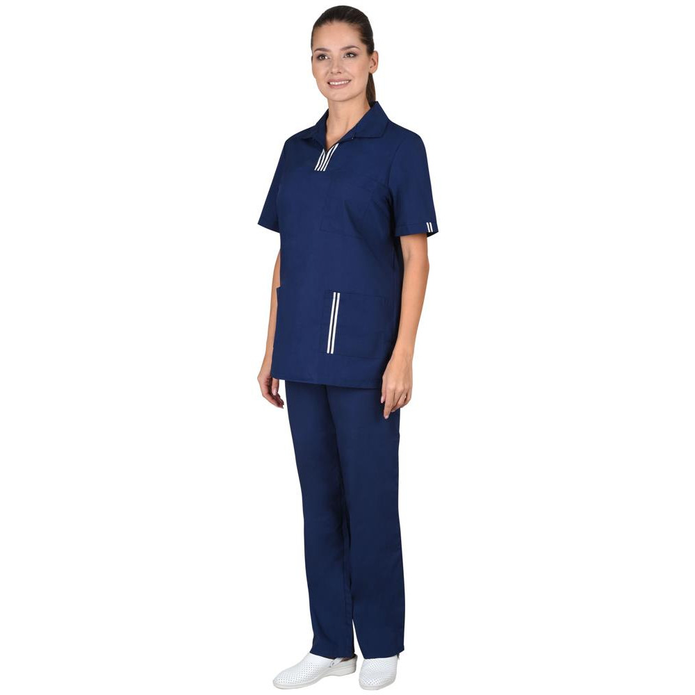 Костюм состоит из блузы и брюк. Блуза прямого силуэта с застежкой на тесьму "молния" в области кокетки. Отложной воротник. Нагрудный левый и два нижних накладных кармана. Рукава втачные, короткие. По низу блузы разрезы в боковых швах.