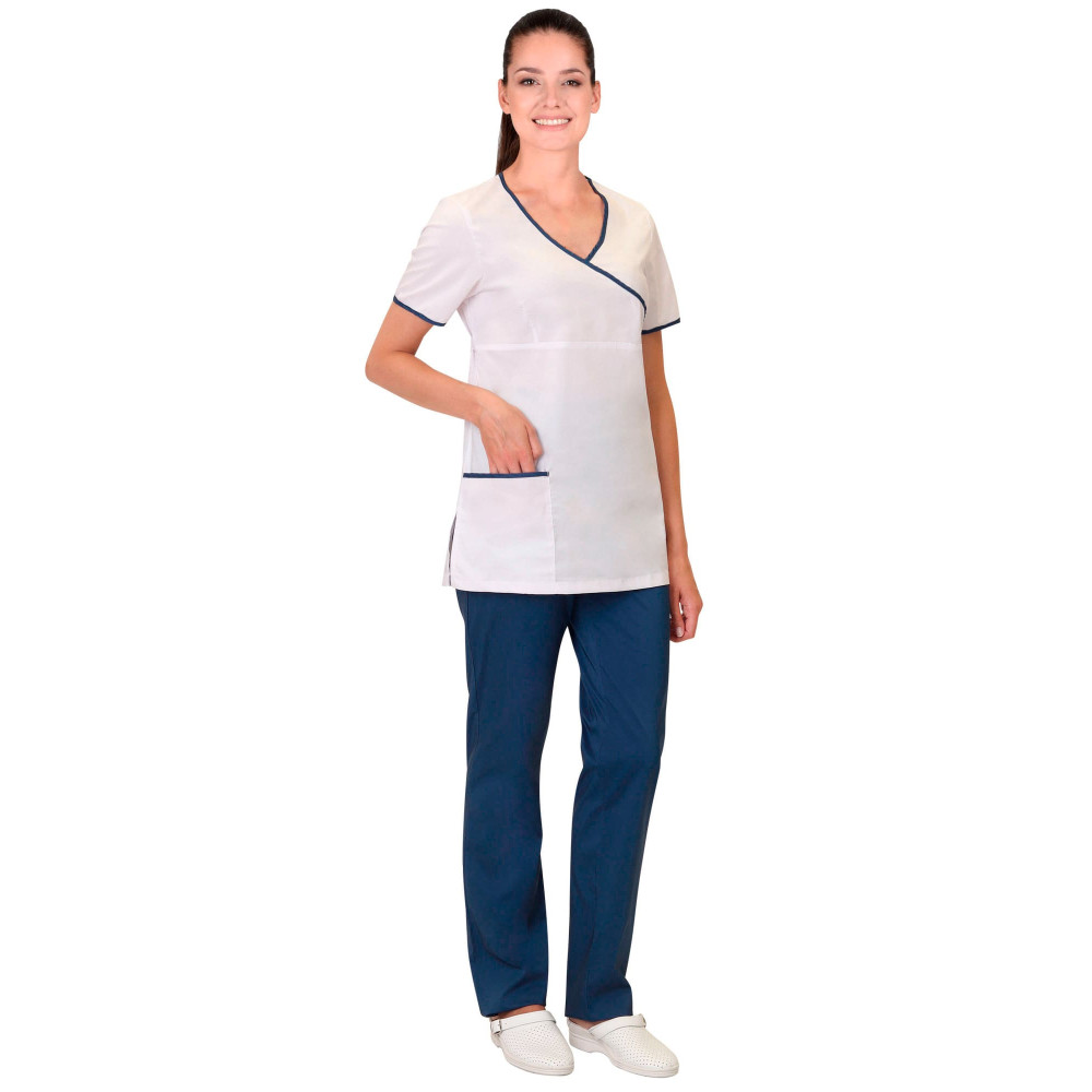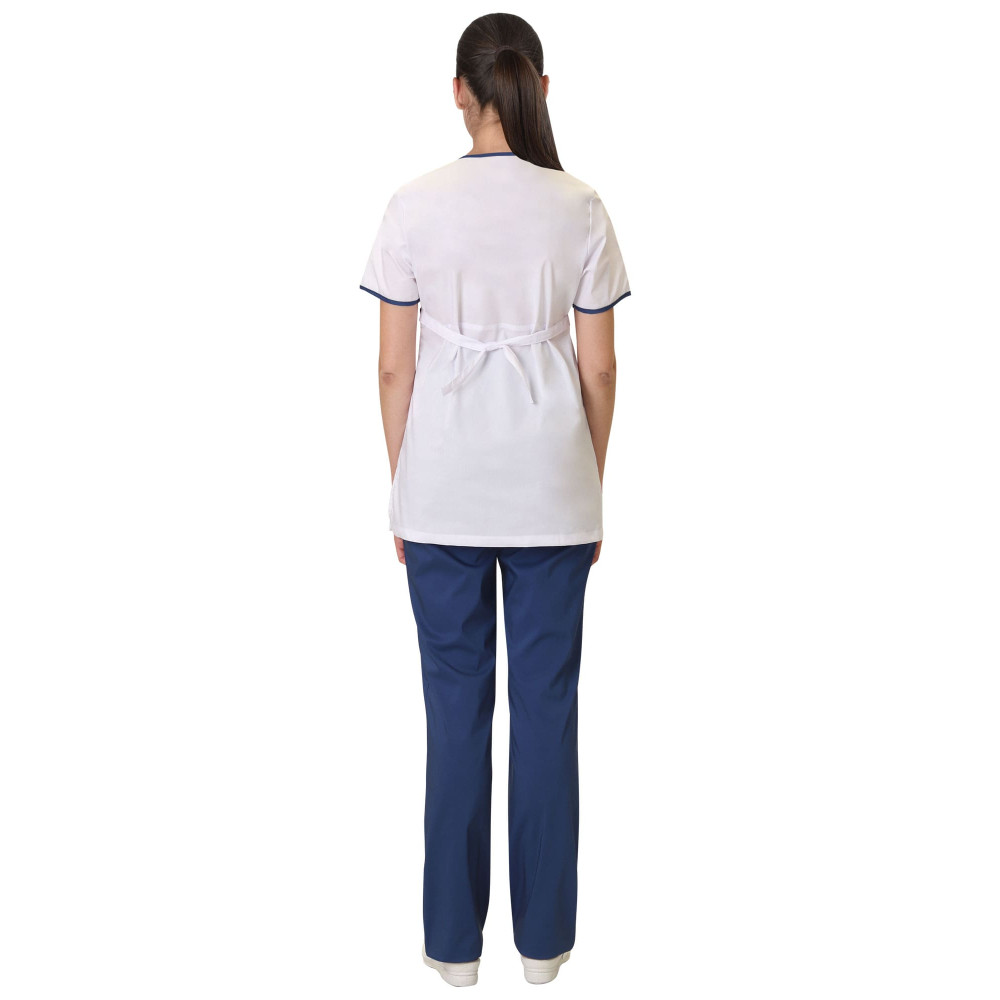 Костюм женский комбинированный из ткани двух цветов состоит из блузы белого цвета и брюк синего цвета. Блуза полуприлегающего силуэта, без застёжки, с V – образным вырезом, с накладным карманом, с втачными короткими рукавами. Горловина, низ рукавов и верх кармана окантованы косой бейкой из ткани отделка. Блуза с завязывающимся сзади поясом. Брюки прямые с притачным поясом стянутым резинкой.