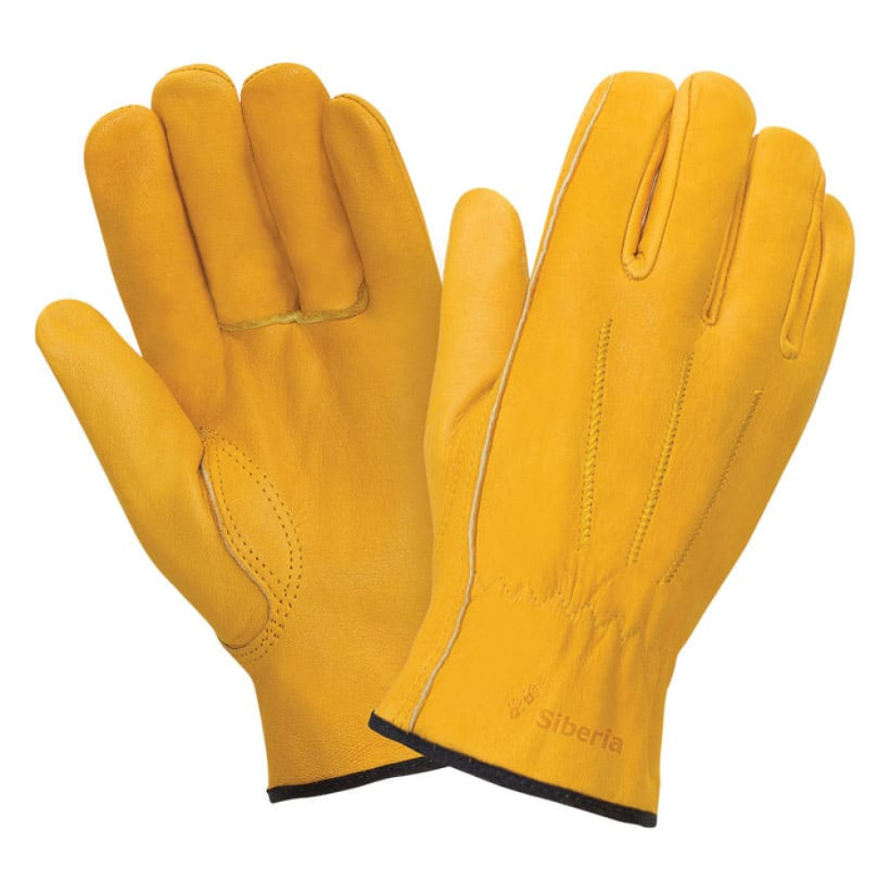 Перчатки Siberia (Сибирь) 0140 для защиты от механических воздействий из кожи КРС желтого (золотого) цвета з кожи КРС желтого (золотого) цвета из спинной части шкур, мягкая и растяжимая при значительной толщине 1,4 мм (+/– 0,2), сорт А+, на запястье резинка, специальная обработка кожи создает высокий комфорт при контакте перчатки с кожей руки. На запястье резинка, двойные швы, нить Kevlar. Перчатки обеспечивают высокий комфорт, тактильную чувствительность и удобство манипулирования, высокий уровень защиты от истирания и разрыва, хорошие показатели защиты от пореза и прокола. Перчатки рекомендованы для продолжительного ношения, могут быть использованы для проведения общих работ для защиты от механических воздействий в отсутствии жидких загрязнителей, таких как масло, водные растворы и тд, для защиты рук от ОПЗ, истирания, при работе с инструментом для ИТР. Размер 8.5, 9.5, 10.5, 11.5