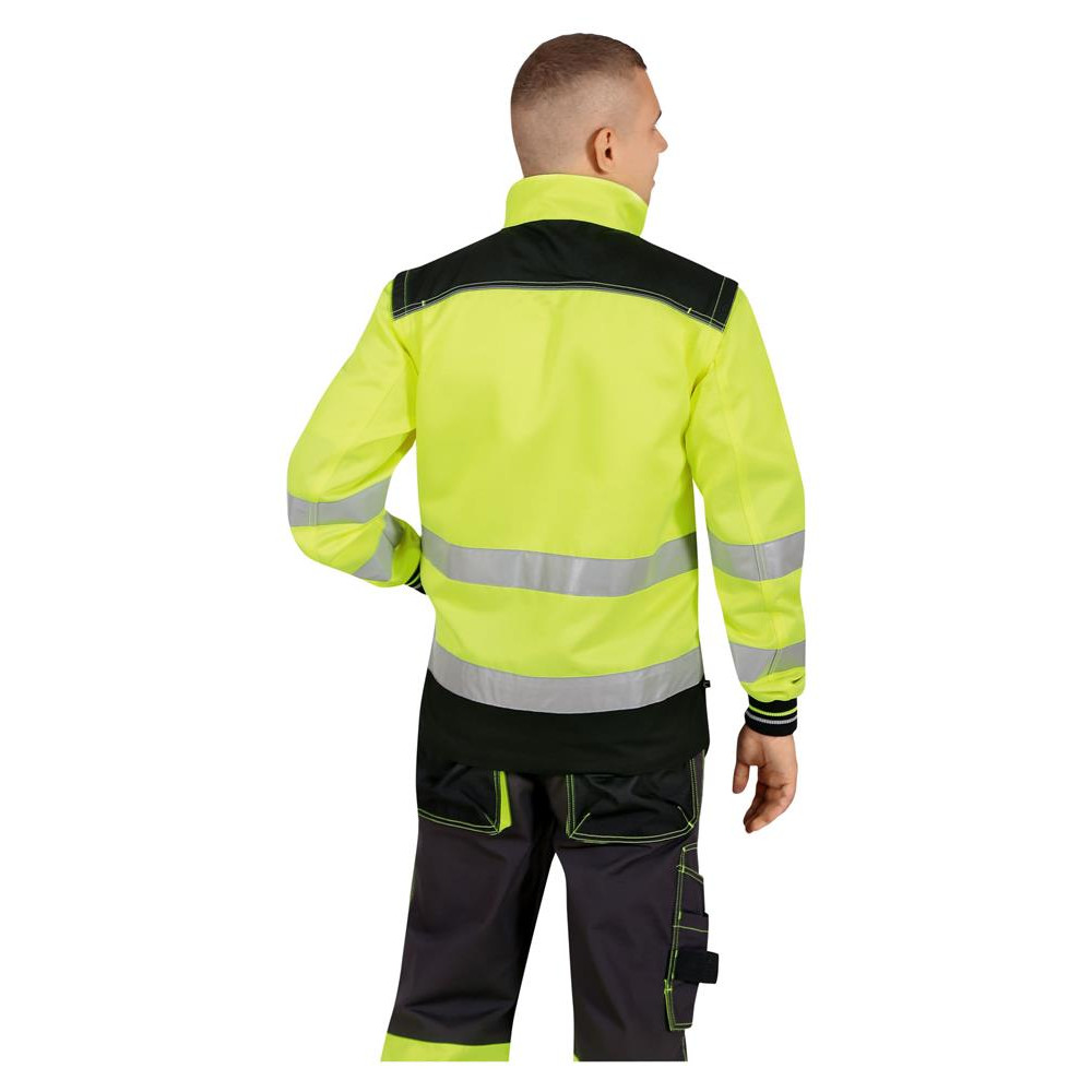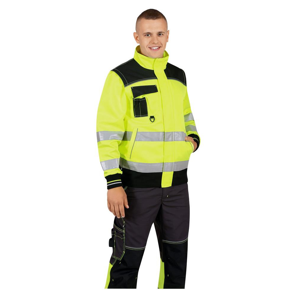 Усилительные накладки: на кокетке полочек и спинки, по низу куртки Световозвращающие элементы: по две полосы вокруг торса и вокруг рукавов, канты на кокетках и на карманах