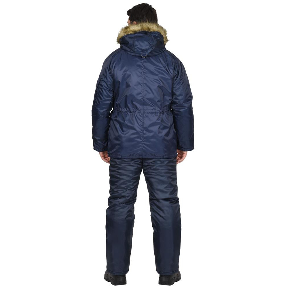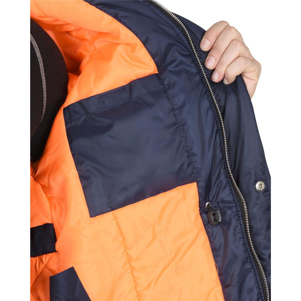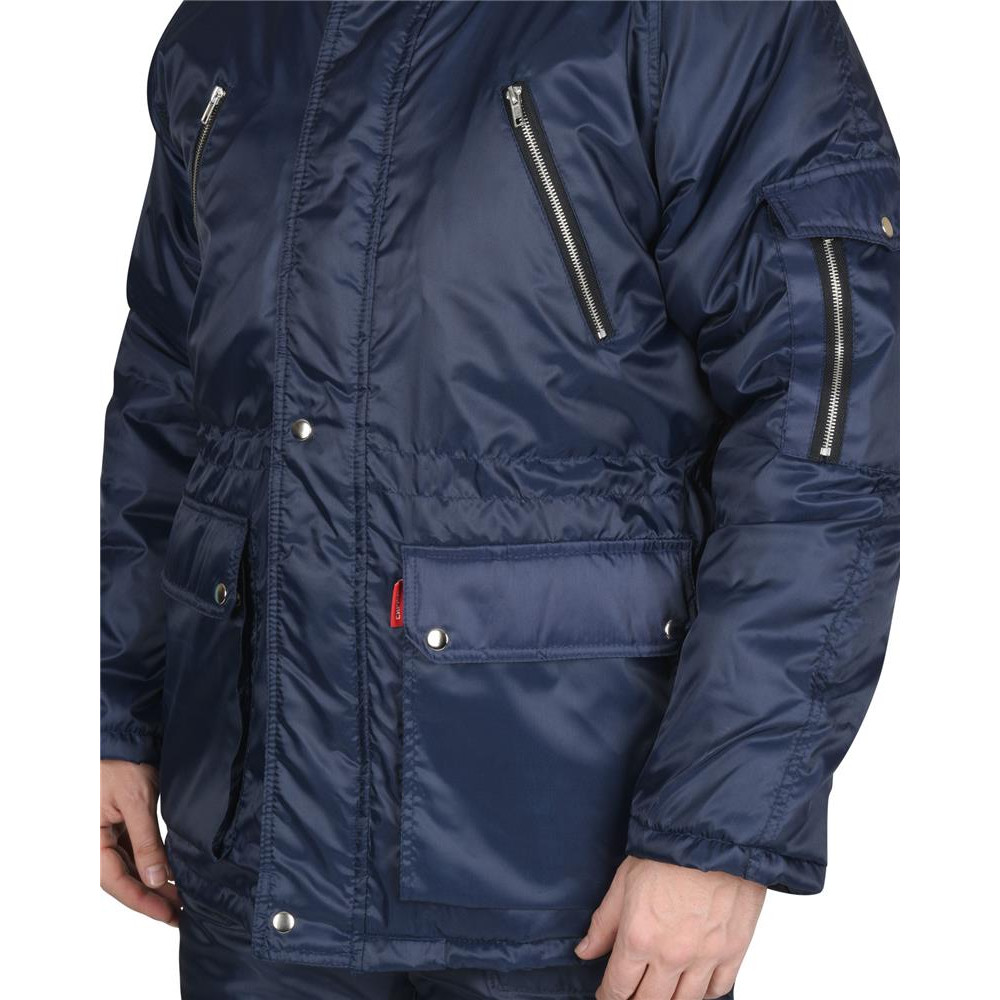 Куртка удлинённая, утеплённая, прямого силуэта; с рукавами реглан; с втачным утеплённым капюшоном; с центральной бортовой застёжкой на металлическую молнию; с ветрозащитным клапаном, застёгивающимся на 4 кнопки; с верхними прорезными карманами на «молнии» и нижними двойными накладными карманами с объёмами с клапанами на кнопках. Рукава с внутренними трикотажными напульсниками. Объём куртки по талии и низу регулируется при помощи шнура и фиксаторов.