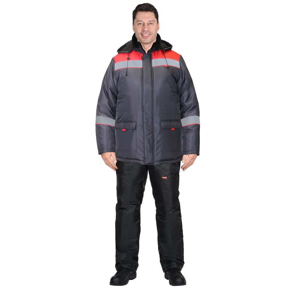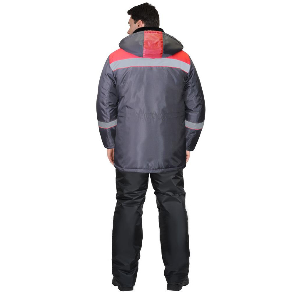 Куртка удлинённая, на утеплённой подкладке, с воротником стойка, внутренний воротник меховой, с центральной застёжкой на молнию до края воротника, которая закрыта ветрозащитной планкой, со съёмным капюшоном. Куртка с нижними накладными карманами с клапаном и с карманом на левой стороне подкладки. По талии куртки кулиска для регулирования объема. В куртке предусмотрена светоотражающая полоса 50мм для обозначения сигнальной видимости.
