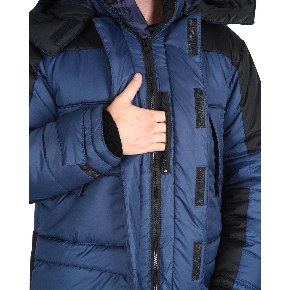 Куртка прямого силуэта; с горизонтальными строчками настрачивания слоя утеплителя на детали полочек, спинки, рукавов; воротник - «стойка»; с тесьмой «молния» по горловине, скрытой под планкой, для пристёгивания капюшона; с центральной бортовой застёжкой на двухзамковую тесьму «молния» и двумя внешними ветрозащитными клапанами, застёгивающимися на 4 текстильные застёжки «липучки» длиной 9,5см и одну кнопку, по низу планки; с внутренним ветрозащитным клапаном правой полочки (от верхнего края воротника до низа куртки), из ткани подкладка.