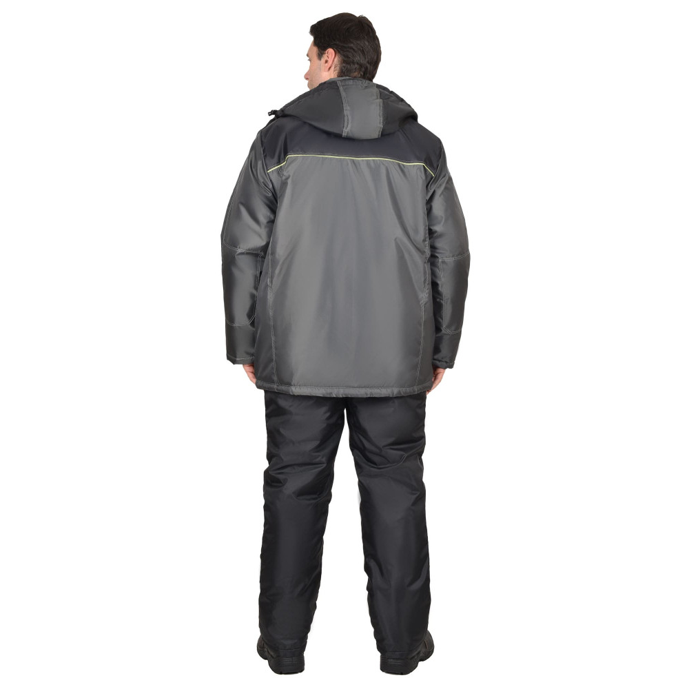 Куртка длинная прямого силуэта, с притачной утеплённой подкладкой, с центральной застёжкой на тесьму - «молния», ветрозащитной планкой на левой полочке застегивающиеся на потайную липучку и 5-ю малыми декоративными патами, с подпланкой правой полочки и воротником - «стойка». Рукава втачные с налокотниками и внутренним трикотажным напульсником.