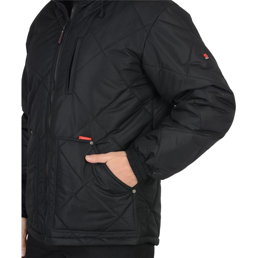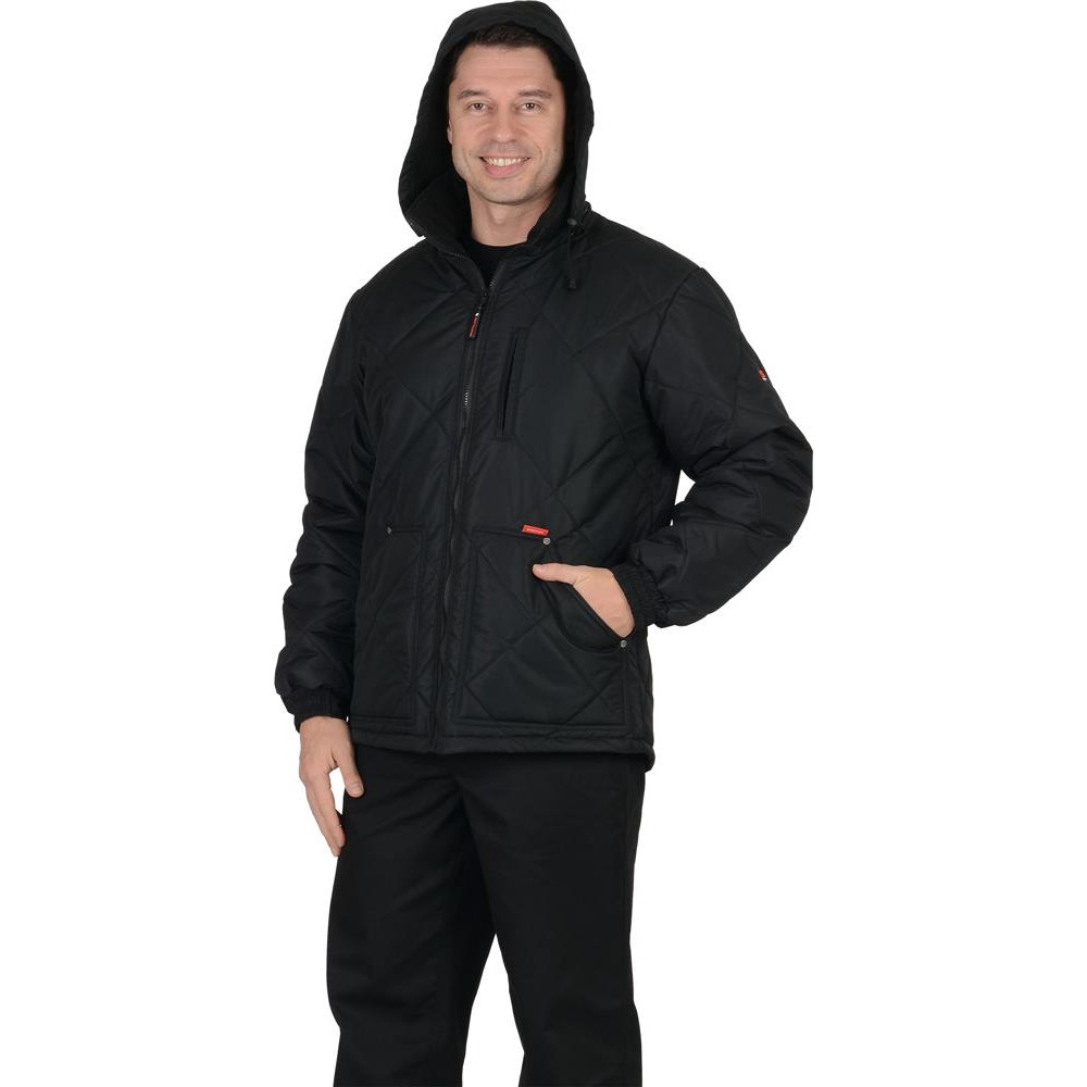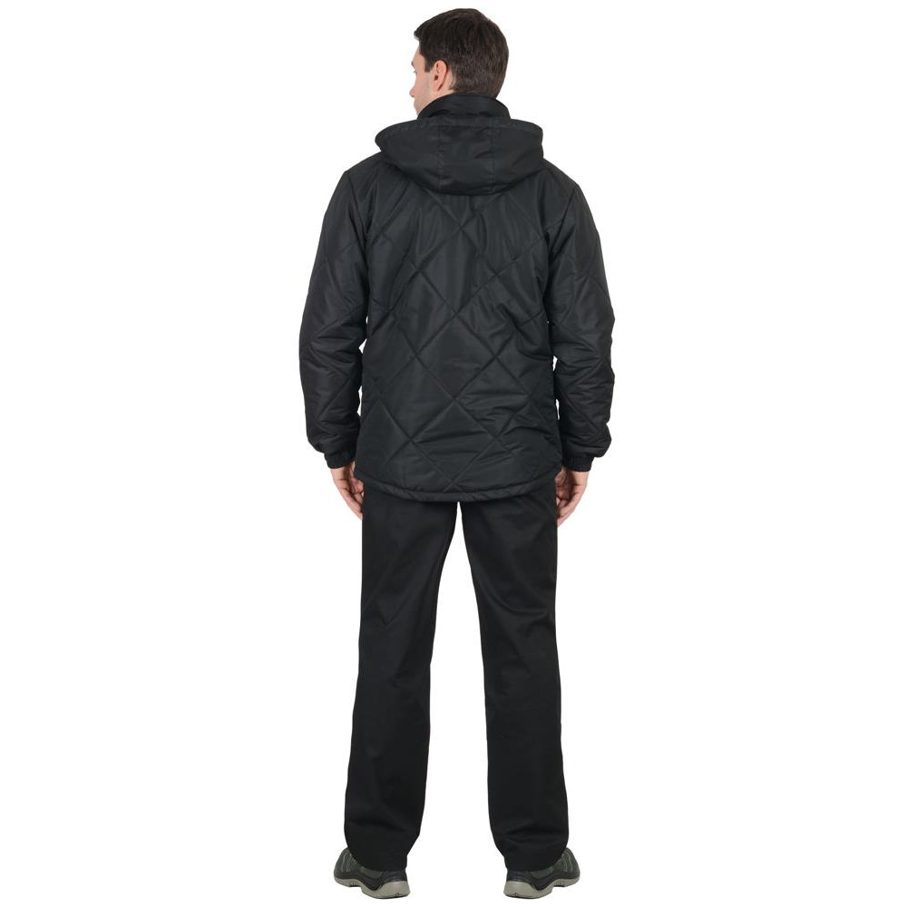Куртка утеплённая, длинная, на подкладке, со съёмным капюшоном, прямого силуэта, с центральной бортовой застёжкой на тесьму "молния", с воротником "стойка", с верхним прорезным и нижними накладными карманами, рукава втачные с притачными манжетами, манжеты частично стянуты эластичной лентой. Полочки, спинка, рукава и нижние карманы куртки выстёганы с утеплителем в виде ромбов.