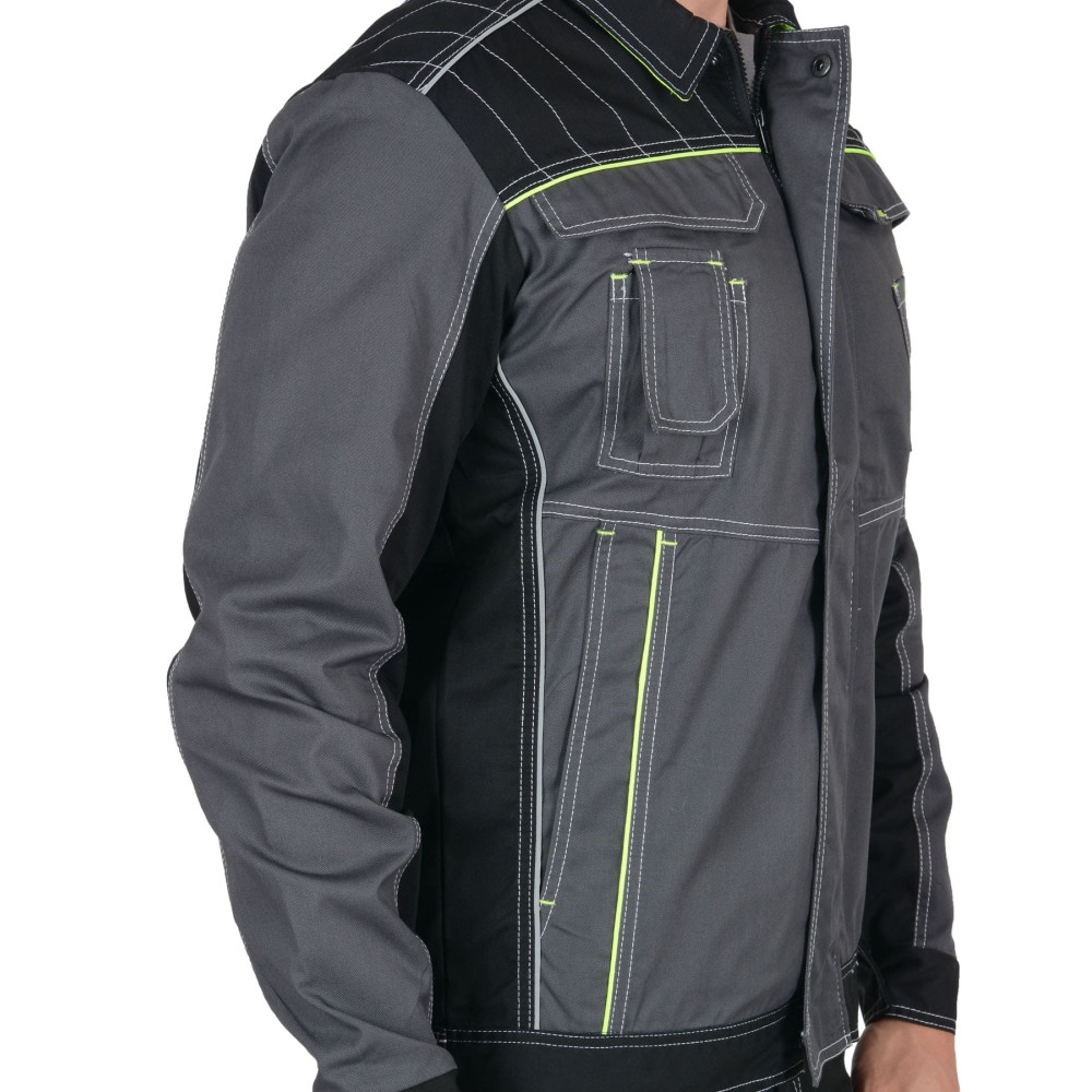Куртка укороченная, прямого силуэта, с центральной застёжкой на молнию под ветрозащитной планкой, с отложным воротником, с различными карманами, с втачными рукавами с манжетами на резинке, на левом рукаве накладной карман с молнией. По низу куртки пояс с хлястиками по боковым сторонам с кнопками для регулировки объёма куртки понизу. В куртке предусмотрен светоотражающий кант и кант лимонного цвета для акцента видимости в тёмное время суток и на отдалённом расстоянии.