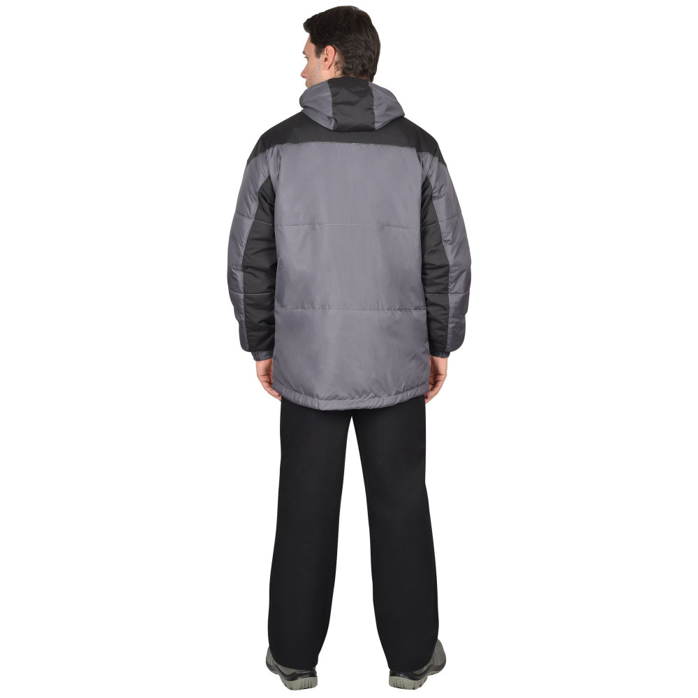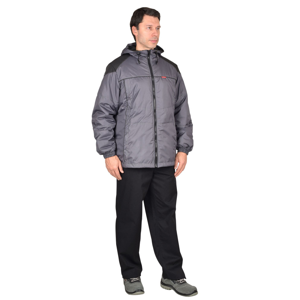 Куртка "Спринтер" мужская, темно-серая с черным Куртка, утеплённая прямого силуэта, с втачным капюшоном, центральной бортовой застёжкой на тесьму - "молния", с под планкой, с верхними прорезными карманами на "молнии" и нижними карманами в рельефах, с карманом на тесьму - "молния" на подкладке с левой стороны. Рукава втачные, с притачной манжетой частично стянутые на ткацкую резинку.
