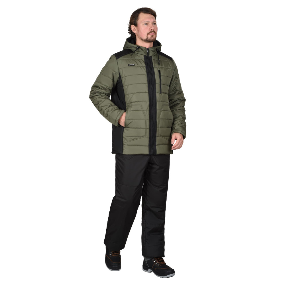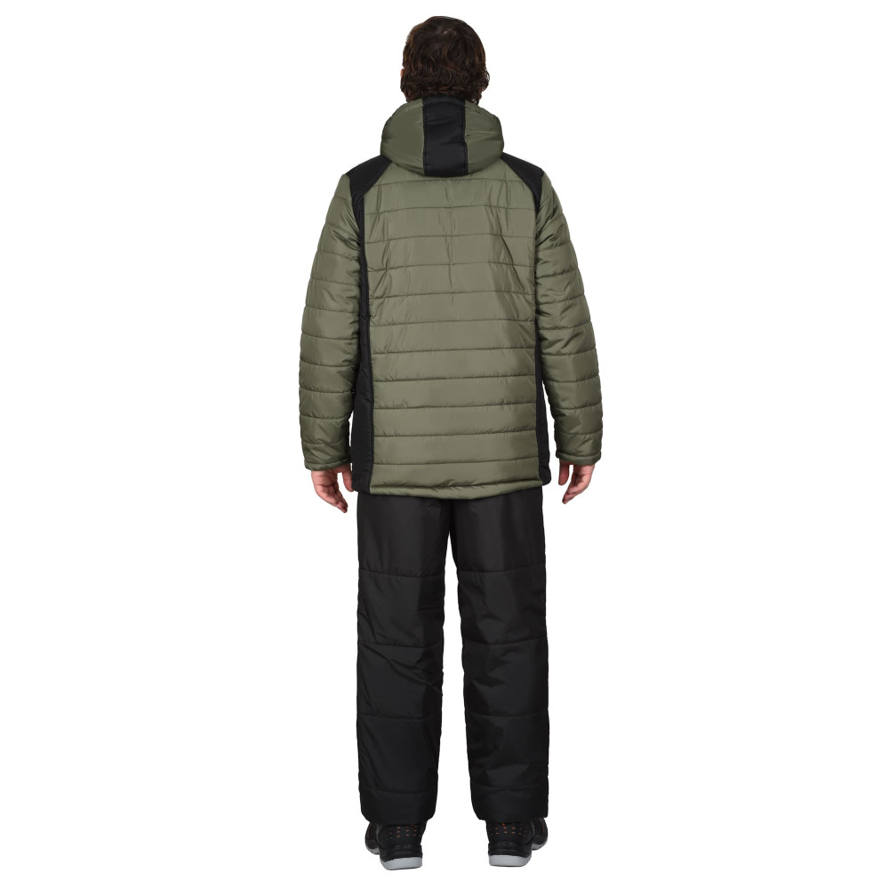 Куртка комбинированная из ткани двух цветов, с центральной застежкой на молнию, с удлиненной фигурной линией низа по спинке, с втачным капюшоном, с втачными рукавами. Куртка с левым нагрудным прорезным карманом на молнию, нижние карманы в швах. На подкладке с правой стороны накладной карман на молнию.