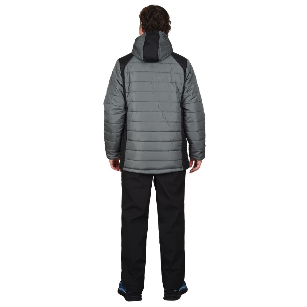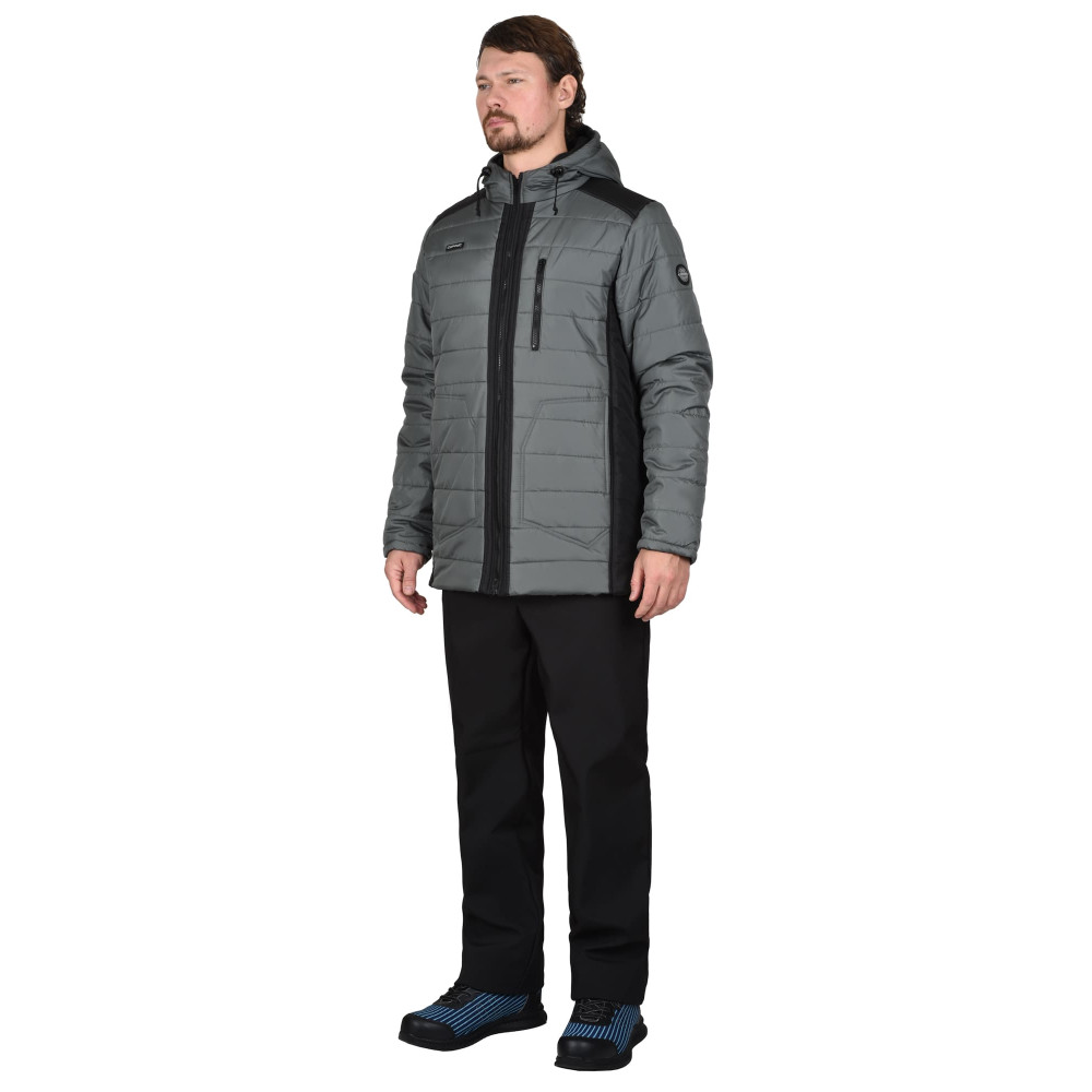 Куртка комбинированная из ткани двух цветов, с центральной застежкой на молнию, с удлиненной фигурной линией низа по спинке, с втачным капюшоном, с втачными рукавами. Куртка с левым нагрудным прорезным карманом на молнию, нижние карманы в швах. На подкладке с правой стороны накладной карман на молнию.