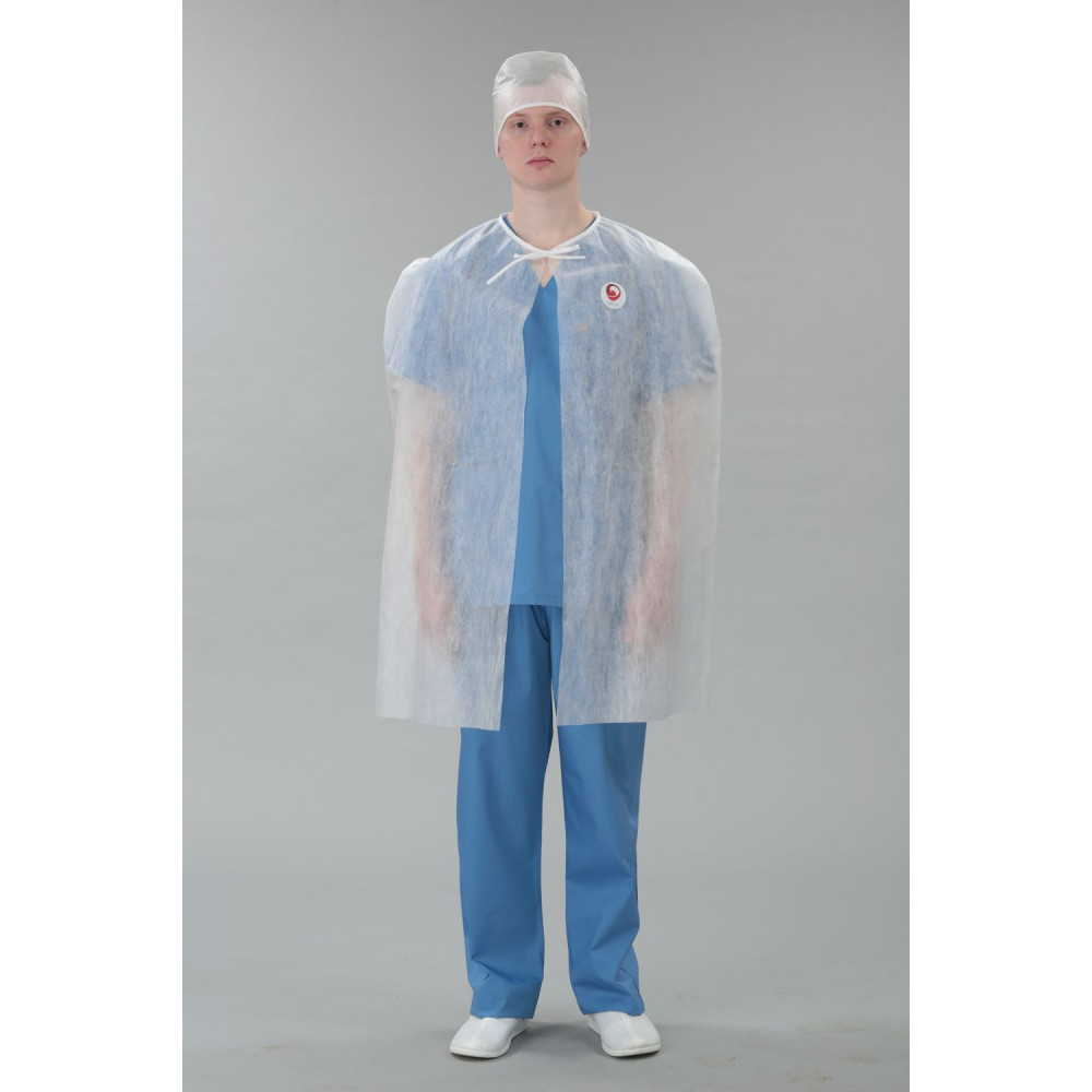Накидка изготовлена из нетканого материала (СМС). Используется в медицинских учреждений, пищевых и промышленных производствах.