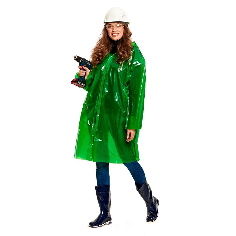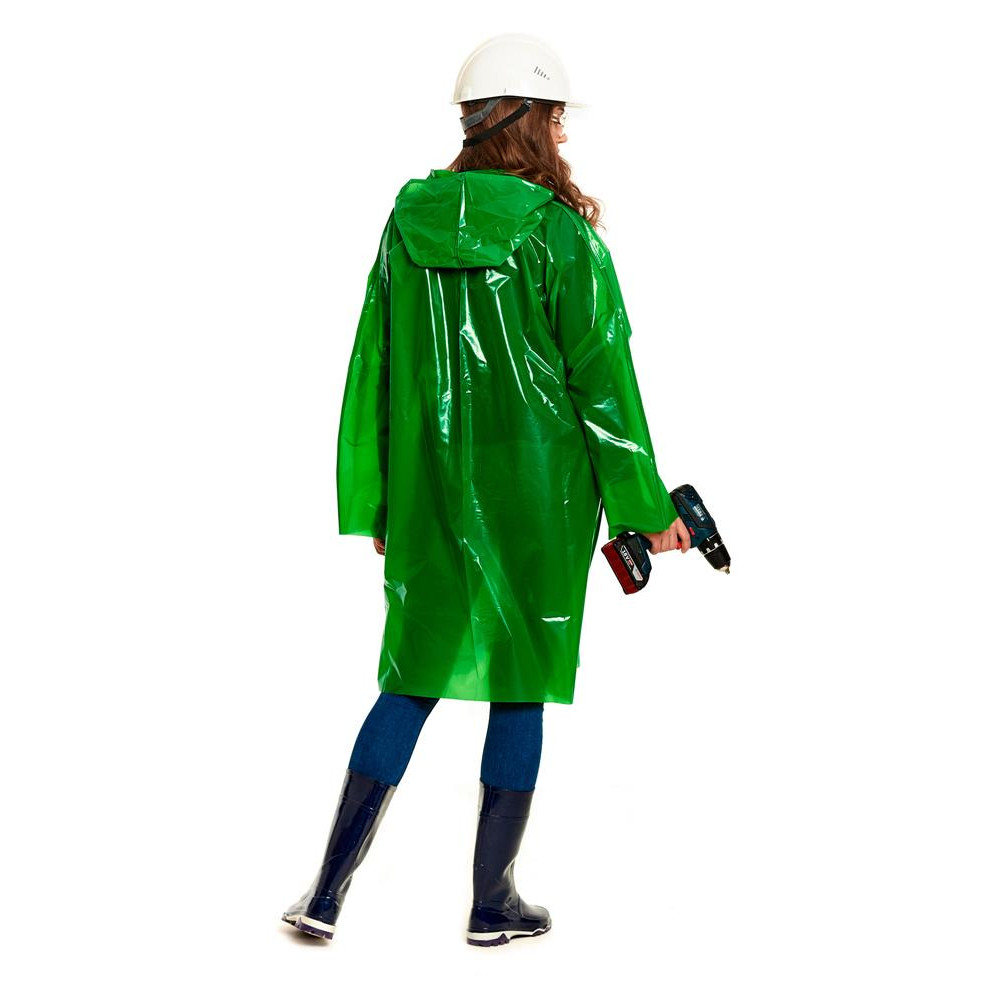 Яркий дождевик серии «Профи» зеленого цвета изготовлен из полиэтилена повышенной прочности.