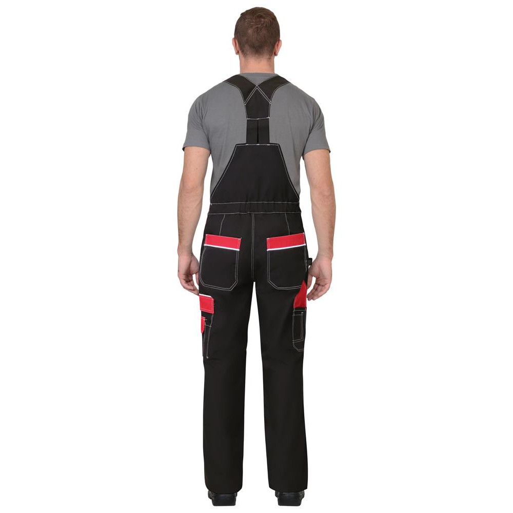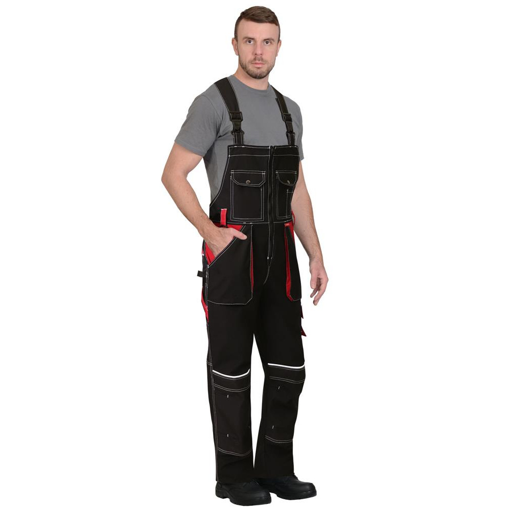 Полукомбинезон прямой с застёжкой спереди на молнию, с отрезной грудкой и отрезной спинкой, с бретелями. Полукомбинезон с накладными карманами спереди, сзади и на боковых швах, с объёмными наколенниками из плотной, непромокаемой ткани с верхним входом для амортизационного вкладыша. Бретели регулируются при помощи застежек-фастексов и резинки. В полукомбинезоне предусмотрен светоотражающий кант.