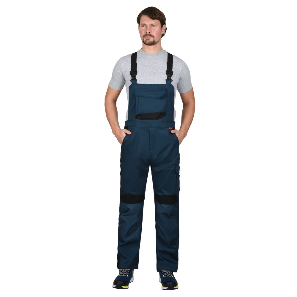 Полукомбинезон прямой с застёжкой спереди - гульфик с молнией, с отрезной грудкой, отрезной спинкой, с бретелями. В боковом шве полукомбинезона со стороны задней половинки вставка из эластичного материала для удобства использования. Полукомбинезон с карманами спереди, сзади и на боковых швах, с объёмными наколенниками из полиэфирной, плотной, непромокаемой ткани с верхним входом для амортизационного вкладыша. Бретели регулируются по длине.