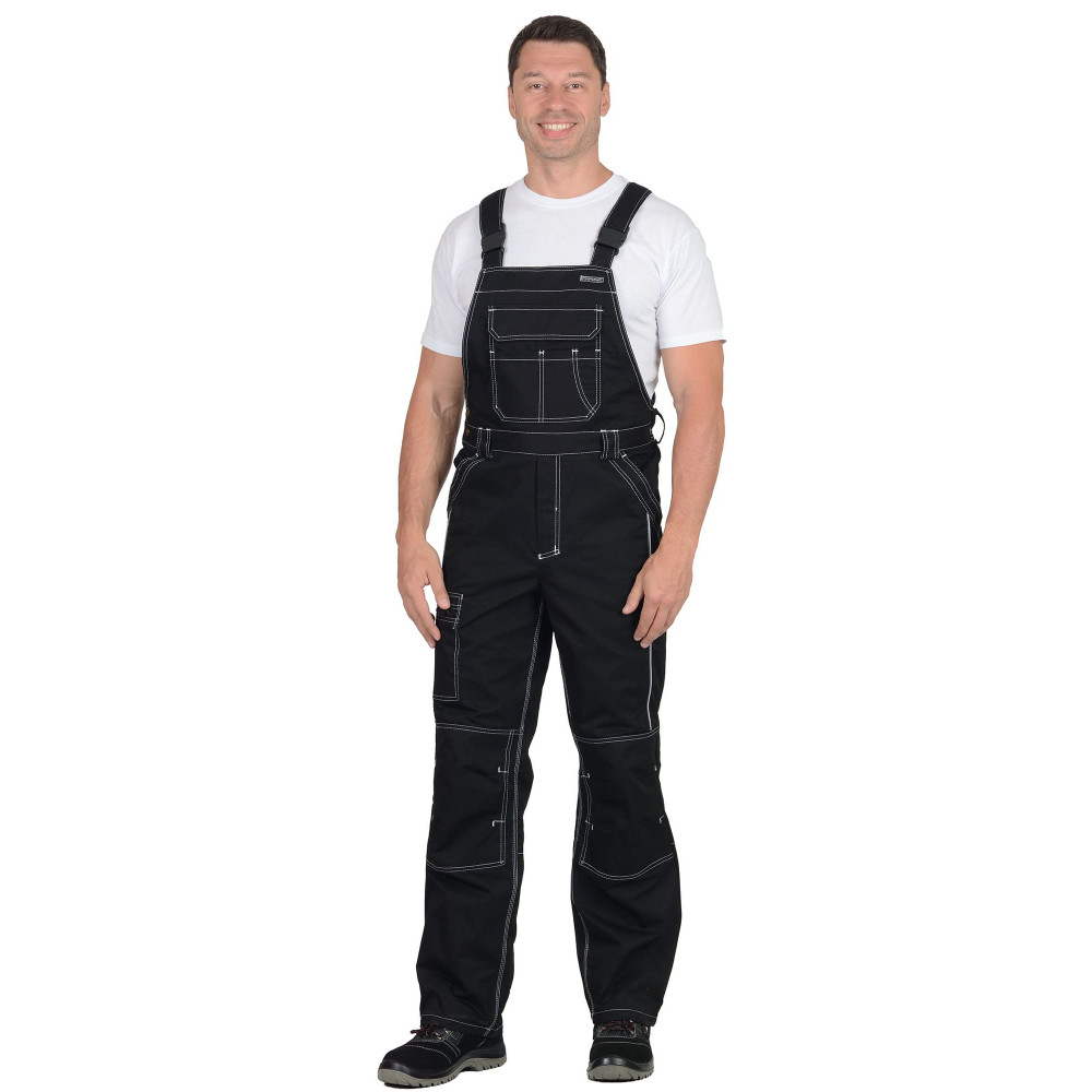 Полукомбинезон с застёжкой спереди - гульфик с молнией и с застёжкой в правом боковом шве на пуговицы, с наколенниками, с бретелями. Полукомбинезон спереди с боковыми внутренними карманами и нагрудным карманом с клапаном, на липучке. Сзади полукомбинезон по талии стянут резинкой для лучшего прилегания по фигуре, на правом боковом шве на уровне колена карман с молнией. Бретели с резинкой, длина бретелей регулируется застежкой-фастексом. В полукомбинезоне спереди предусмотрен светоотражающий кант для обозначения сигнальной видимости.