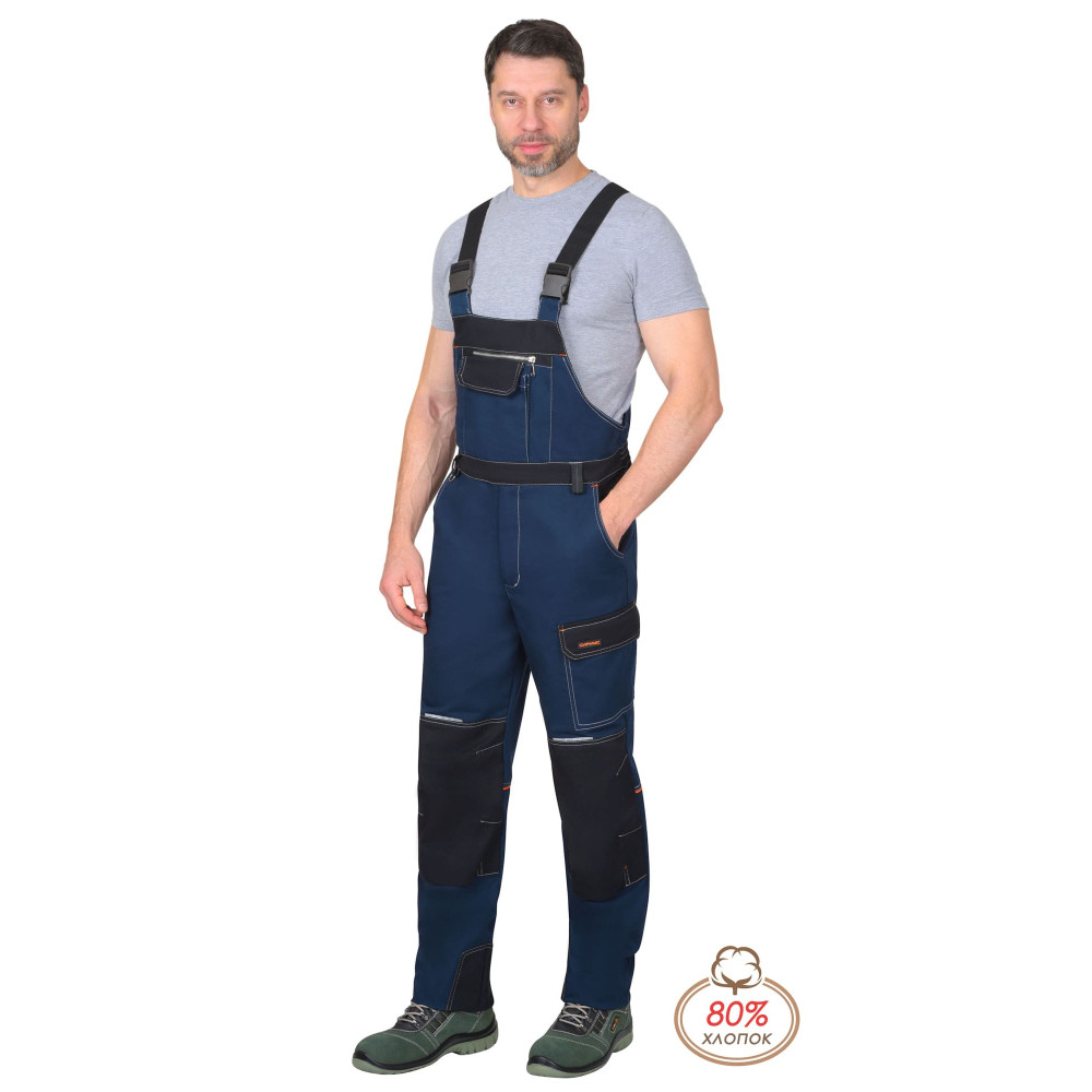 Полукомбинезон с застежками: гульфик на молнию, левая боковая на кнопки. На грудке многофункциональный комбинированный карман с клапаном на липучку. Передние половинки с боковыми внутренними карманами и объемными наколенниками. На левом боковом шве накладной полуобъемный карман с фигурным клапаном на липучку. Задние половинки с кантом контрастного цвета, кокеткой и накладными фигурными карманами. По шаговым швам брюк усиленные фигурные накладки. Пояс брюк с широкими шлевками. По шаговым швам полукомбинезона усиленные фигурные накладки. По спинке на всю ширину резинка для лучшего прилегания. Полукомбинезон с бретелями из резинки, длина регулируется застежкой-фастексом.