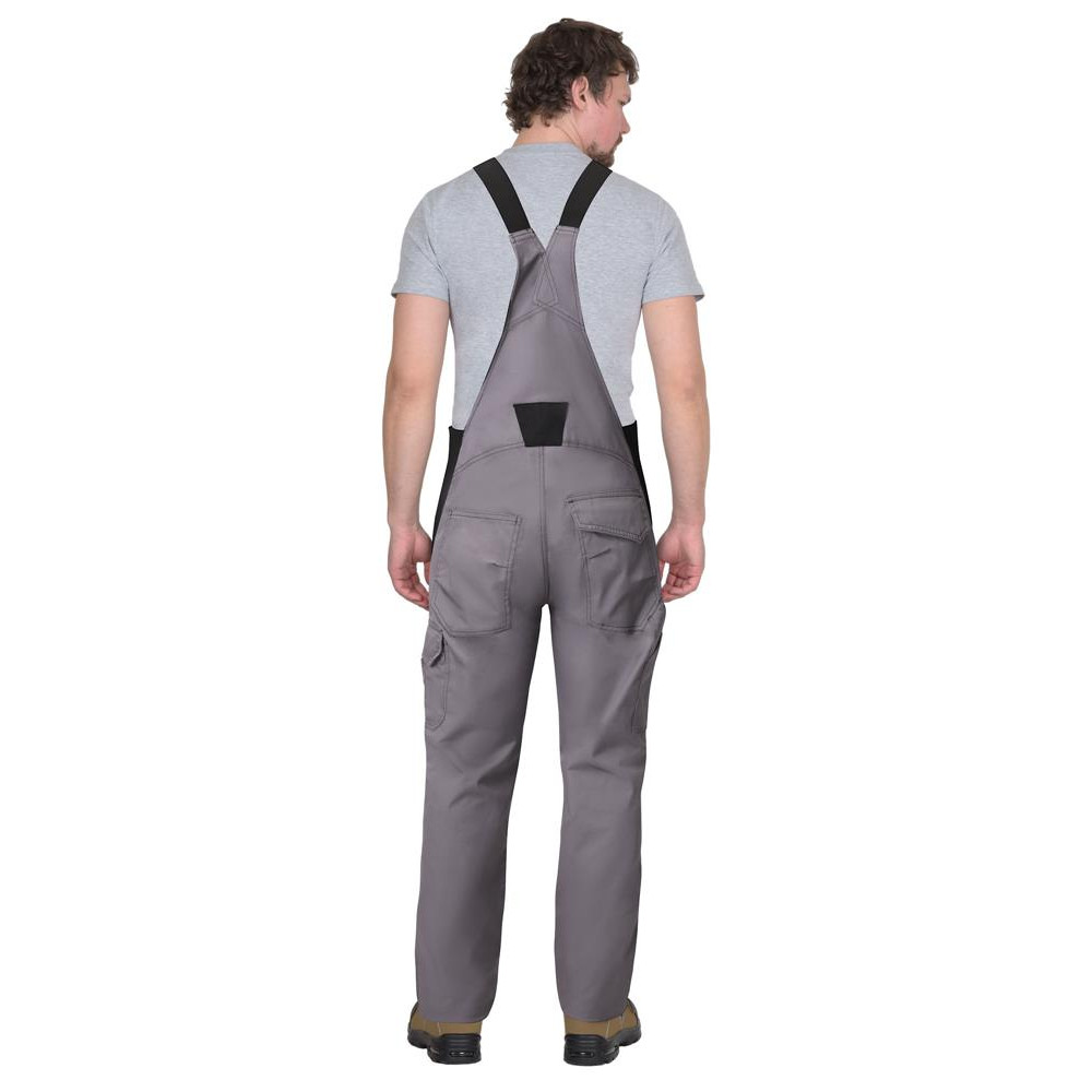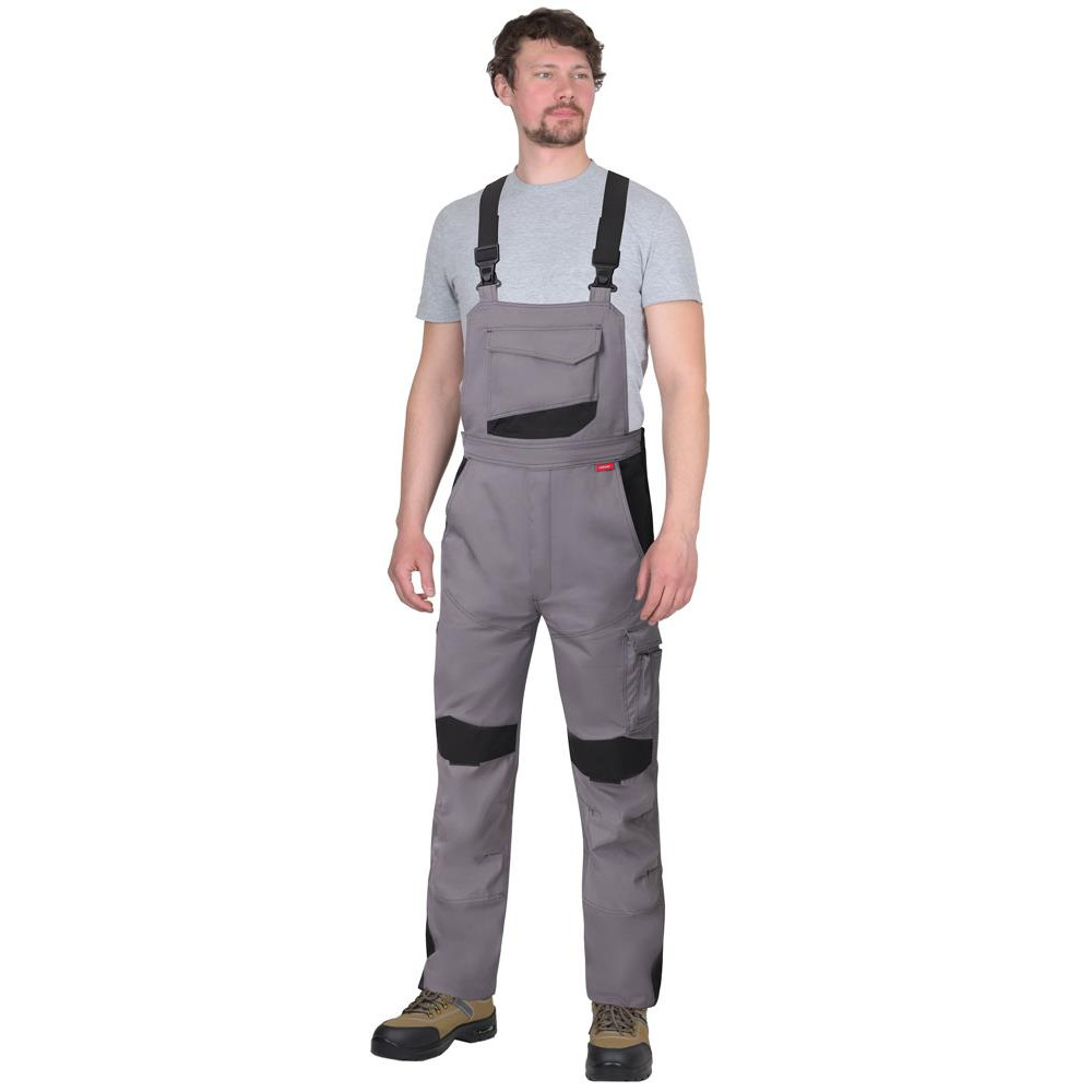 Полукомбинезон прямой с застёжкой спереди - гульфик с молнией, с отрезной грудкой, отрезной спинкой, с бретелями. В боковом шве полукомбинезона со стороны задней половинки вставка из эластичного материала для удобства использования. Полукомбинезон с карманами спереди, сзади и на боковых швах, с объёмными наколенниками из полиэфирной, плотной, непромокаемой ткани с верхним входом для амортизационного вкладыша. Бретели регулируются по длине.