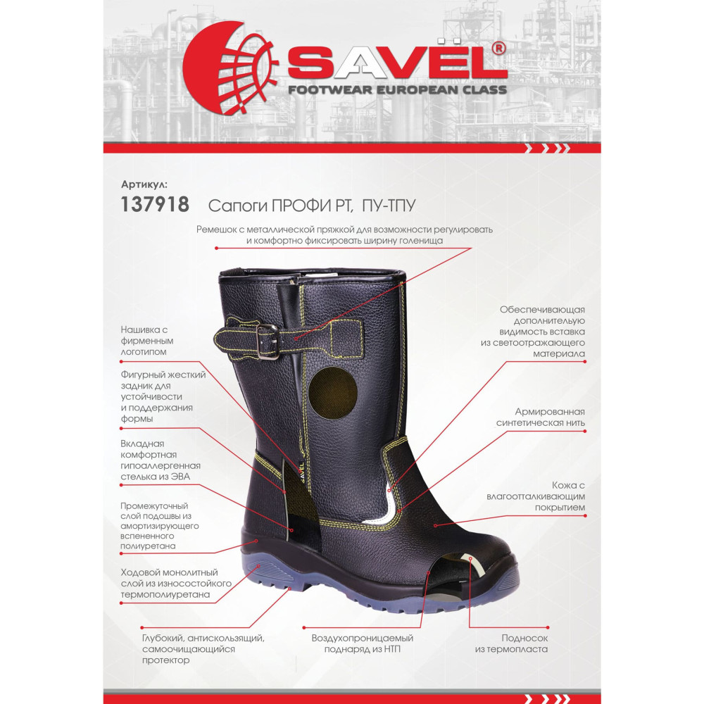 Подклад в сапогах серии "SAVEL-Профи" жёлтого цвета и выполнен из воздухопроницаемого нетканого материала «типика», который обеспечивает комфортный микроклимат, быстро сохнет и имеет высокую степень устойчивости к истиранию. Верх сапога имеет контрастные отделочно-скрепляющие строчки жёлтого цвета, как и подкладка. Колодка обладает полнотно-размерными характеристиками защитной обуви, предназначенной для эксплуатации в летний и весенне-осенний периоды, даёт возможность работать полный рабочий день с комфортом и без усталости.