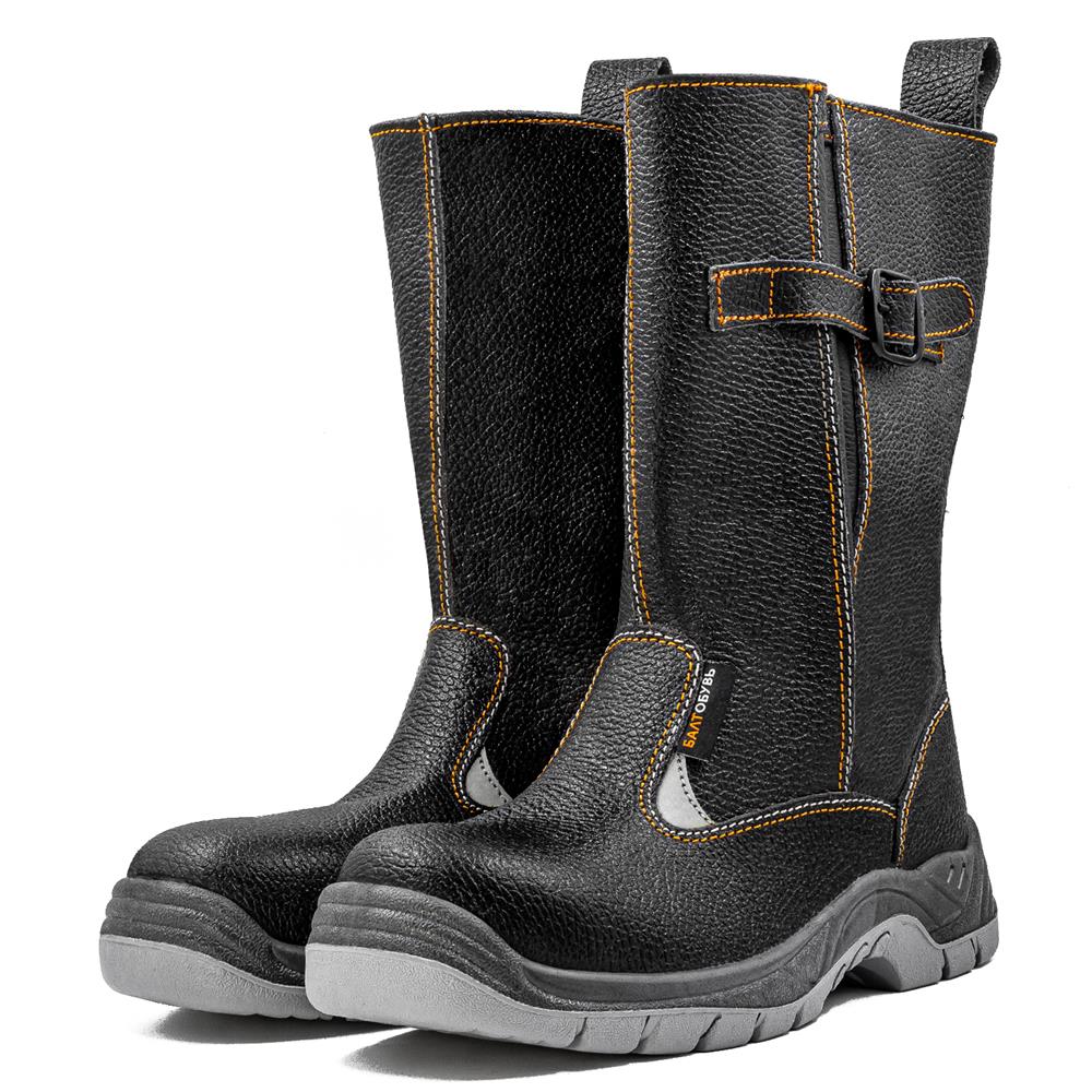 Защитные сапоги на двухслойной ПУ (полиуретановой)/нитрильной подошве изготовлены из натуральной юфтевой кожи устойчивой к воздействию агрессивных внешних факторов. Носок защищен композитным подноском с ударной нагрузкой до 200 Дж. Подошва изготовлена литьевым методом, устойчива к воздействию кислотно-щелочных веществ (до 20%), масло-бензольных соединений и нефтепродуктов. Рабочая температура эксплуатации ботинок от -45°С до +300°С. Амортизатор в пяточной части сапога обеспечивает дополнительный комфорт для ног. Анатомическая стелька из ЭВА обеспечивает комфорт носки и снижает нагрузку на суставы ног