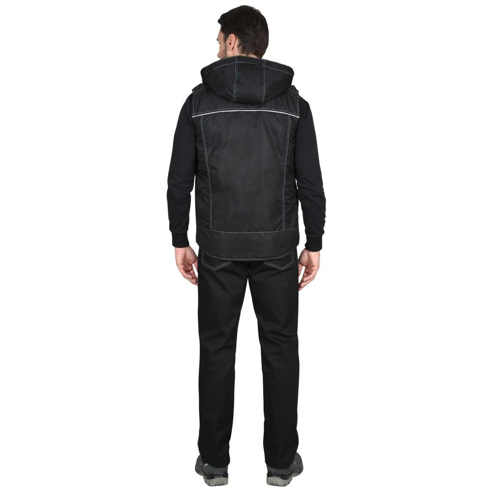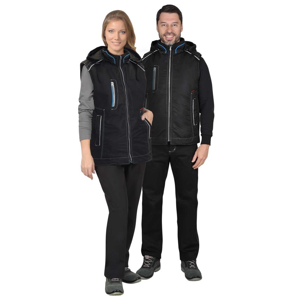 Жилет, с утеплённой подкладкой, однотонный с отделочными строчками и отделочными кантами контрастных цветов. Жилет с воротником стойка, с застёжкой на молнию, с внутренним ветрозащитным клапаном, со съёмным капюшоном, который пристёгивается к воротнику на молнию. Спинка жилета, удлинённая с фигурной линией низа. Жилет с одним нагрудным карманом с молнией и двумя нижними боковыми карманами. Внутренний воротник из флиса. Объём капюшона по лицевому вырезу регулируется шнуром с фиксаторами. Подкладка с утеплителем, с внутренним карманом с молнией.