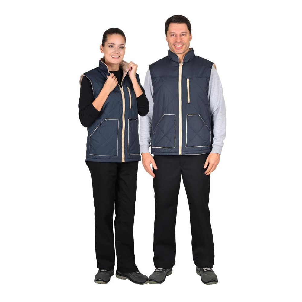 Жилет утеплённый, стёганный, прямого силуэта, на подкладке из флиса с центральной бортовой застёжкой на молнию, с воротником стойка, с нагрудным карманом с молнией и нижними фигурными утеплёнными карманами. Жилет с удлинённой спинкой. ГОСТ 25295-2003